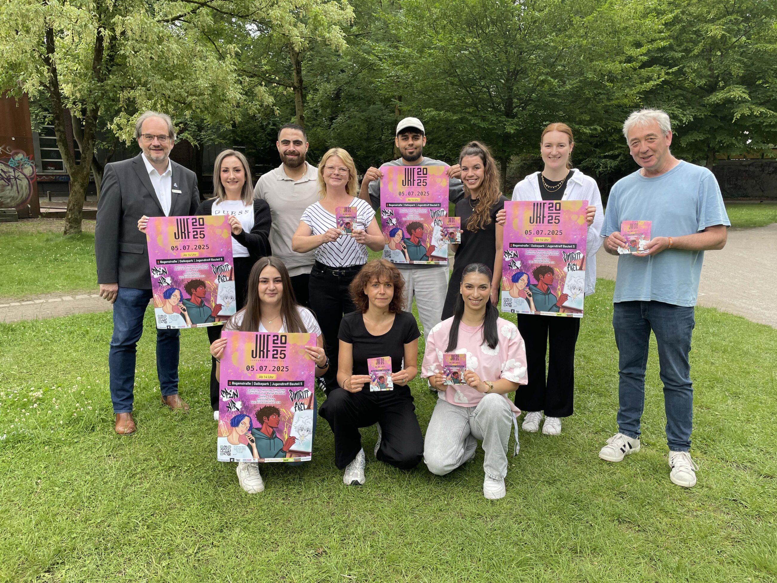 BU: Laden herzlich ein zum 16. Jugendkulturfestival am Samstag, 5. Juli: (hinten v.l.) Bürgermeister Matthias Trepper, Sara Aydin (Bauteil 5, Stadt Gütersloh), Benjamin Ceylan (Bauteil 5, Stadt Gütersloh), Nina Hügle (SJD – Die Falken, Jugendtreff Frei:Raum 17), Sengil Ahmeti (Bauteil 5, Stadt Gütersloh), Beatrice Schmal (AWO Kreisverband Gütersloh, Streetwork Gütersloh), Anna Brentrup (Kreissportbund Gütersloh, Sportjugend), Jörg Teckemeier (Kinder- und Jugendförderung, Stadt Gütersloh) und (vorne v.l.) Anatoli Sachanidou (Bauteil 5, Stadt Gütersloh), Nadine Telljohann (Bürgerzentrum Blankenhagen, Stadt Gütersloh) und Melidiya Usupova (Bauteil 5, Stadt Gütersloh). Foto: Stadt Gütersloh
