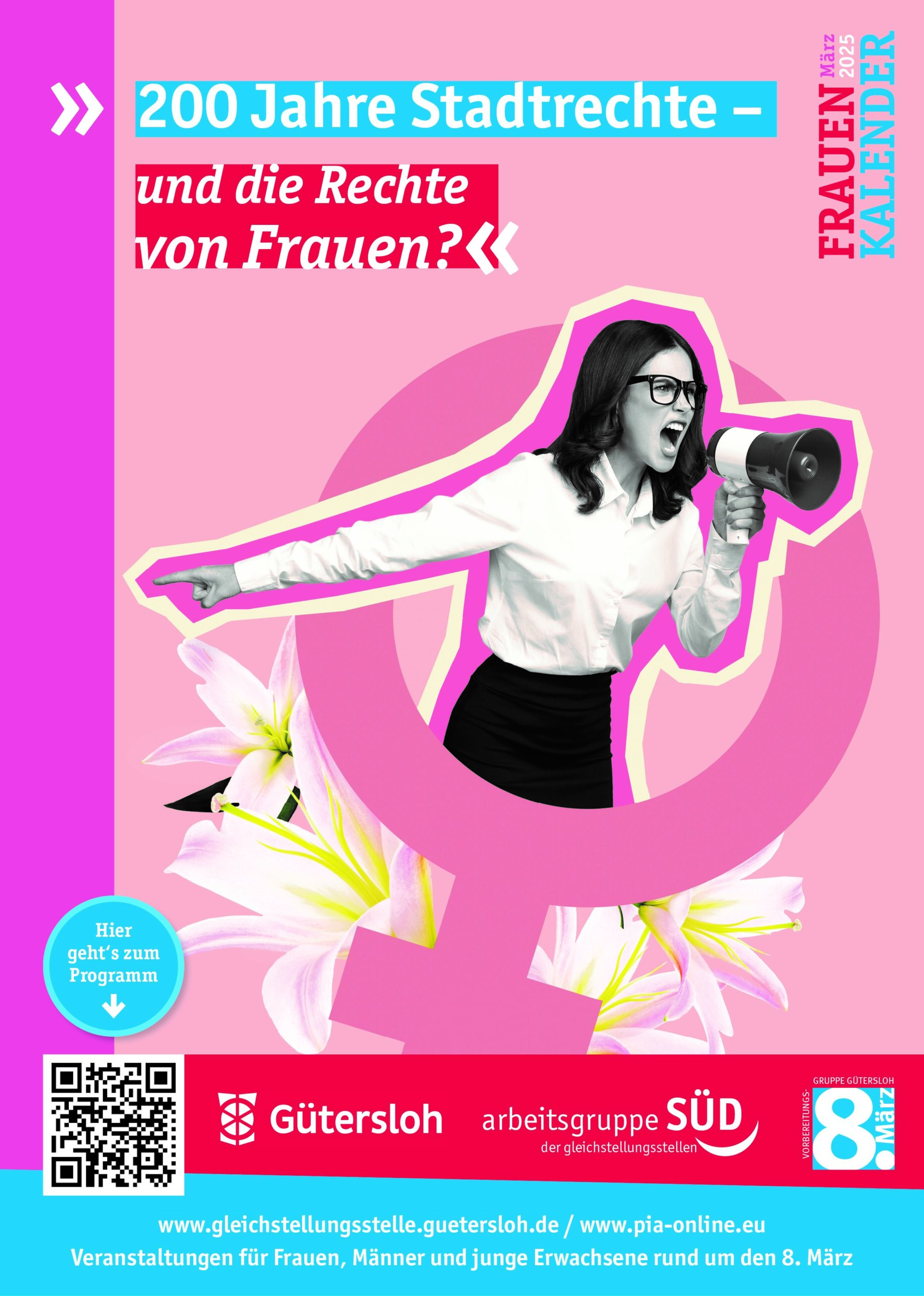 Gütersloh (gpr). Kino, Kunst und Musik, Beratung, Lesungen und Workshops: In der Veranstaltungsreihe zum Internationalen Frauentag gibt es mehr als 20 Treffpunkte in Gütersloh, Rietberg, Schloß-Holte Stukenbrock und Verl, die Informationen und Austausch bieten. Dabei ist der diesjährige Slogan angelehnt an das Gütersloher Stadtjubiläum. Unter dem Motto „200 Jahre Stadtrechte – und die Rechte von Frauen?“ laden die Veranstalterinnen in der Zeit von Montag, 17. Februar, bis Sonntag, 30. März, dazu ein, in ganz unterschiedlichen Veranstaltungsformaten die Entwicklung der Frauenrechte im historischen und aktuellen Kontext zu beleuchten. Dabei stehen die Errungenschaften und Herausforderungen der Frauenrechte im Mittelpunkt – ein Anlass, um zurückzublicken, zu reflektieren und gemeinsam in die Zukunft zu schauen.