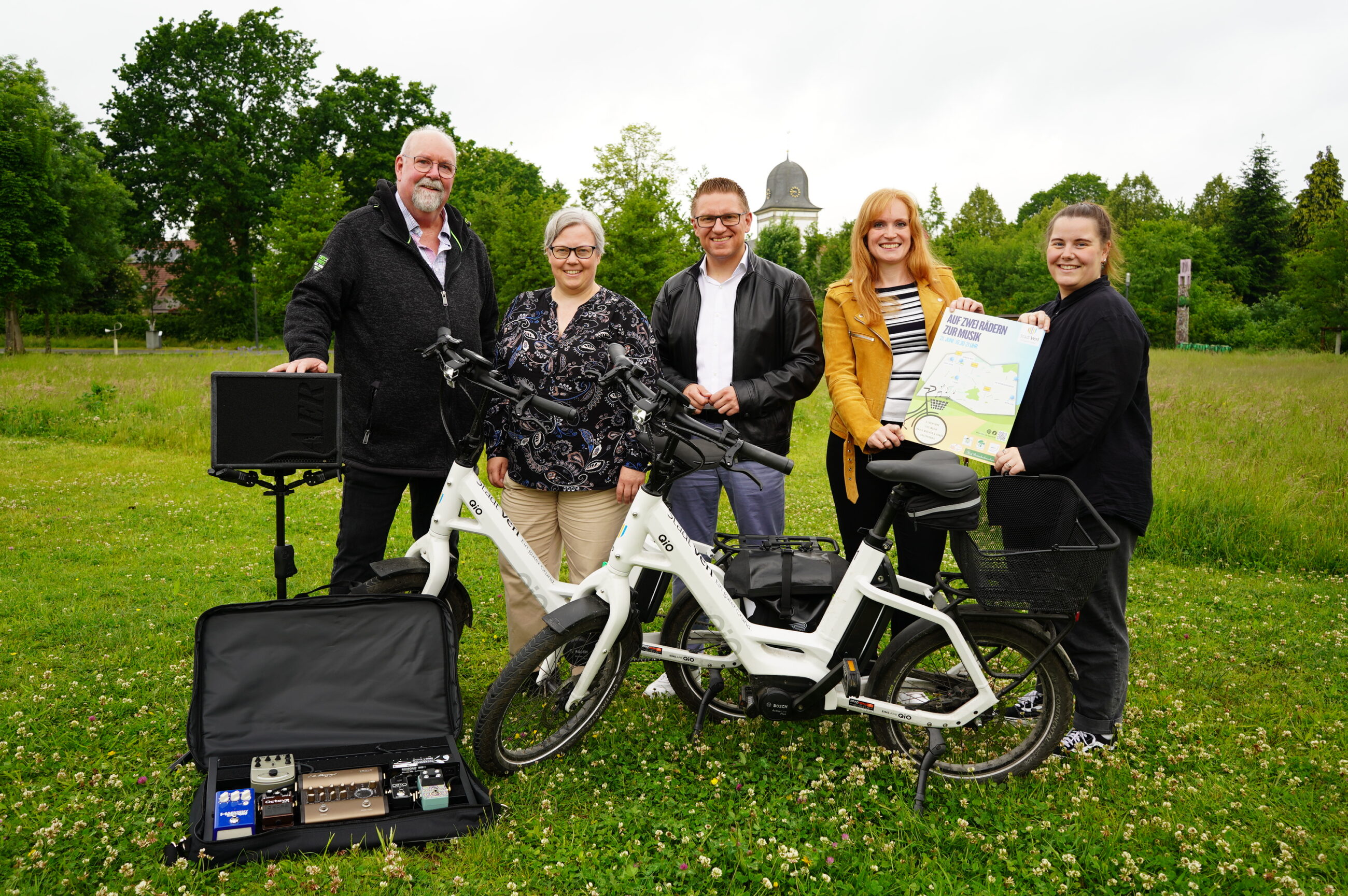 Jay Minor, Beigeordnete Katrin Vilmar, Bürgermeister Robin Rieksneuwöhner, Carina Flake (Stadtmarketing) und Kulturbeauftragte Pauline Meckes (v. l.) laden zur Veranstaltung „Auf zwei Rädern zur Musik“ ein. Die Bürmsche Wiese ist eine von insgesamt fünf musikalischen Stationen.