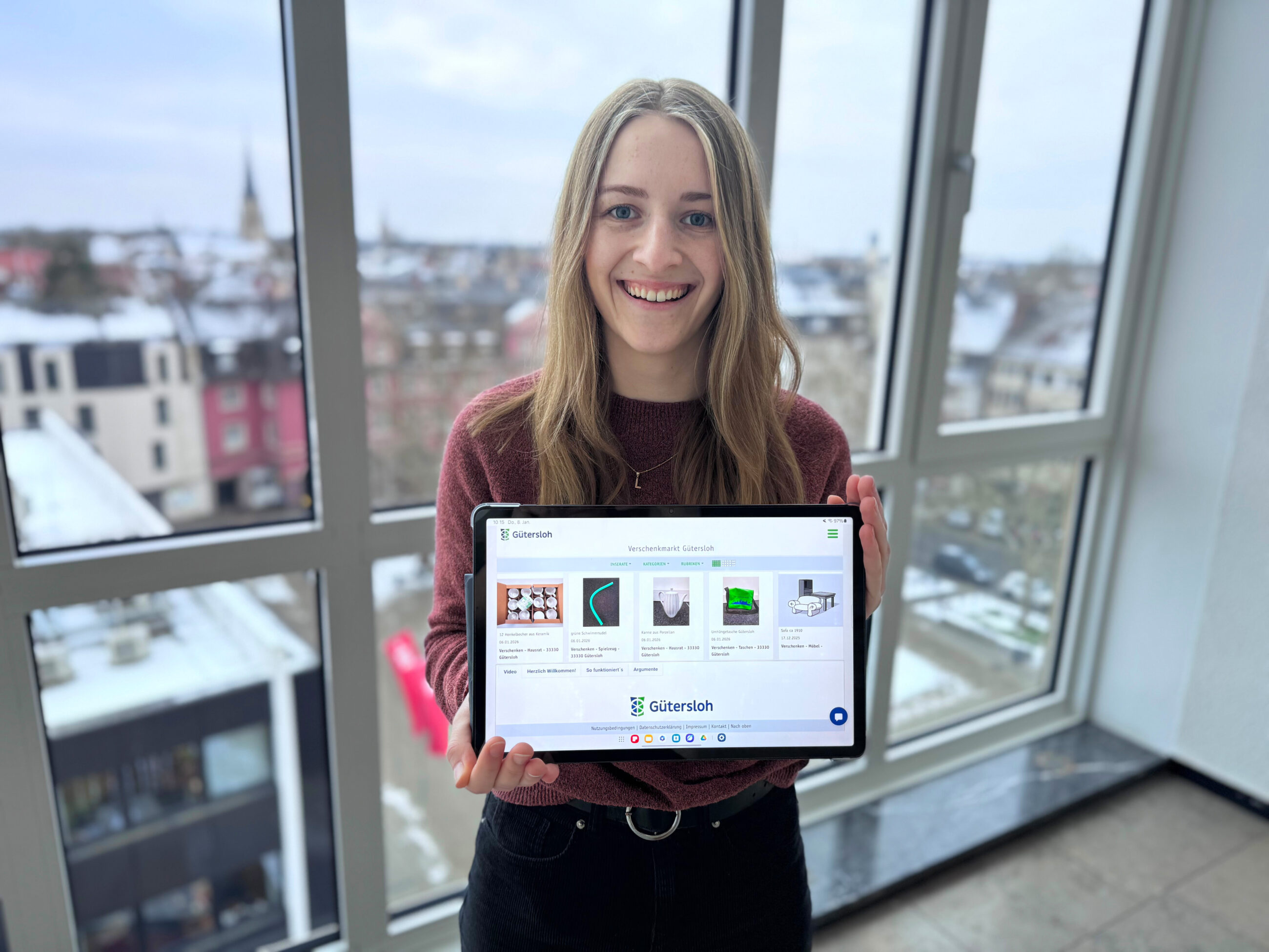 Lillian Kontny, Abfallberaterin der Stadt Gütersloh, präsentiert den neuen Tausch- und Verschenkmarkt für Gütersloh. Auf der neuen Online-Plattform unter www.verschenkmarkt-guetersloh.de können gut erhaltene Gegenstände eingestellt und an Interessierte verschenkt oder getauscht werden. Foto: Stadt Gütersloh