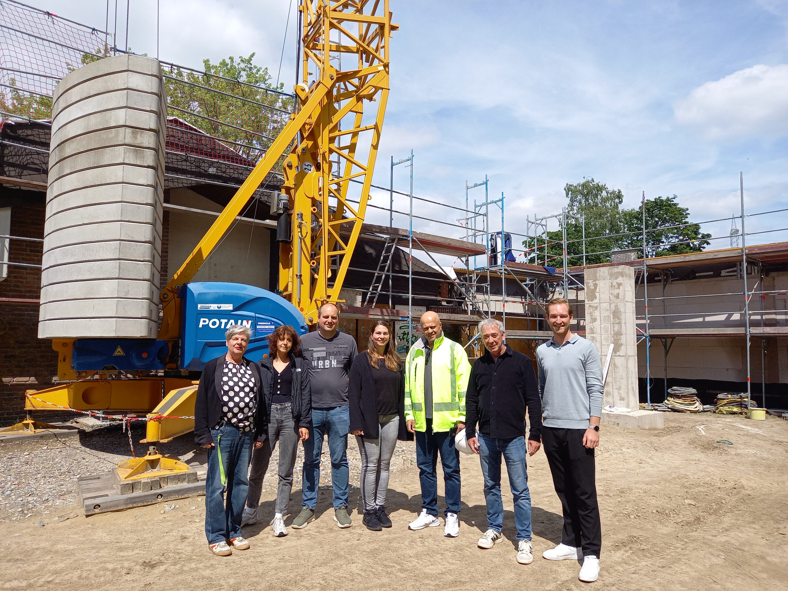 Laden gemeinsam zum Dichtfest des Bürgerhaus Blankenhagen am Freitag, 27. Juni, ein: (v.l.) Ulrike Laubinger (Leitung Grundschule Blankenhagen und Sprecherin der Sozialraumarbeitsgemeinschaft Blankenhagen), Nadine Telljohann (Bürgerzentrum Lukas, Stadt Gütersloh), Oliver Duismann (SPI Gütersloh e.V., OGS-Leitung), Bianca Bindl (Bürgerzentrum Lukas, Stadt Gütersloh), Majed Kour Ahmad (Technisches Gebäudemanagement der Stadt Gütersloh und Bauleitung), Jörg Teckemeier (Kinder- und Jugendförderung, Stadt Gütersloh) und Timon Helfberend (Stadtplanung der Stadt Gütersloh). Foto: Stadt Gütersloh