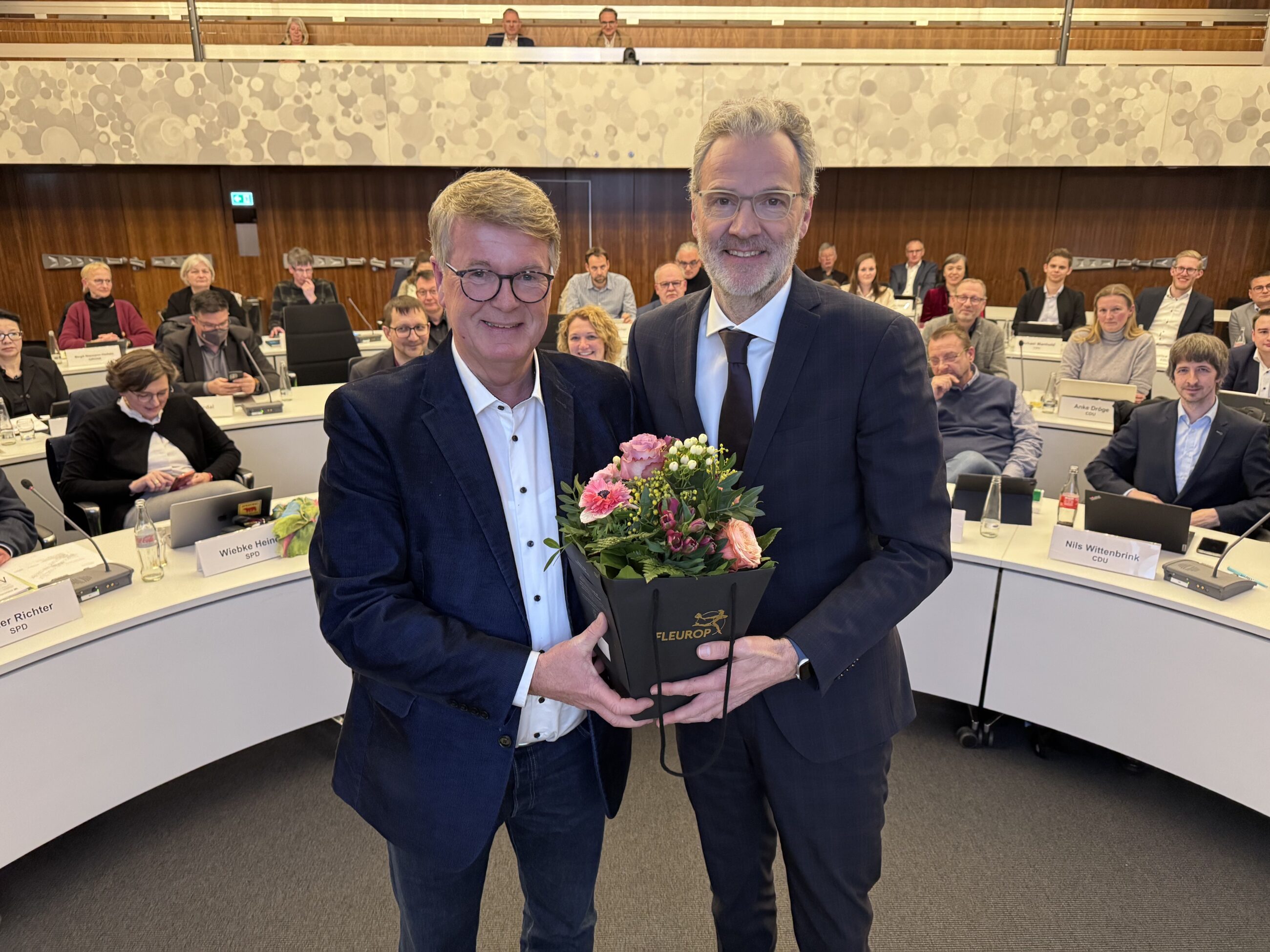 Am 6. Februar nahm Andreas Kimpel (links) zum letzten Mal als Beigeordneter für die Bereiche Kultur und Weiterbildung an der Ratssitzung der Stadt Gütersloh teil und wurde vom ersten stellv. Bürgermeister Markus Kottmann mit Blumen verabschiedet. Foto: Stadt Gütersloh