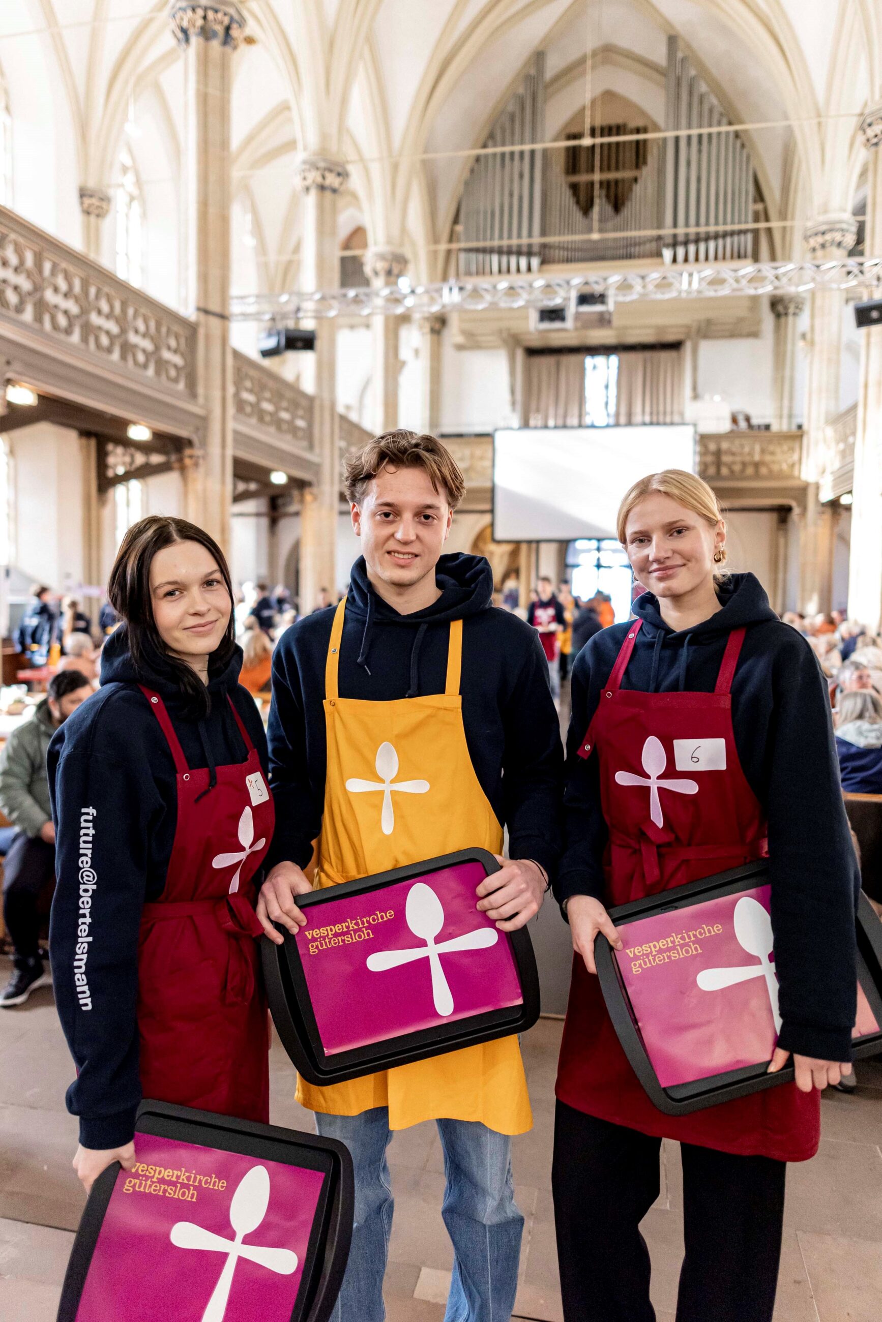 Zum sechsten Mal hat die Zentrale Ausbildung von Bertelsmann für die Vesperkirche ein Team von Auszubildenden zusammengestellt, das vor Ort hilft. „Mittlerweile ist das Engagement unserer Industriekaufleute bei der Vesperkirche fester Bestandteil unserer Ausbildung“, erklärt Klassenlehrer Ernst-Hermann Bedey. „Gerade in aktuell schwierigen wirtschaftlichen und herausfordernden politischen Zeiten leisten die Azubis durch ihre ehrenamtliche Tätigkeit einen tollen Beitrag für unsere Gesellschaft im Allgemeinen und die Vesperkirche im Besonderen.“