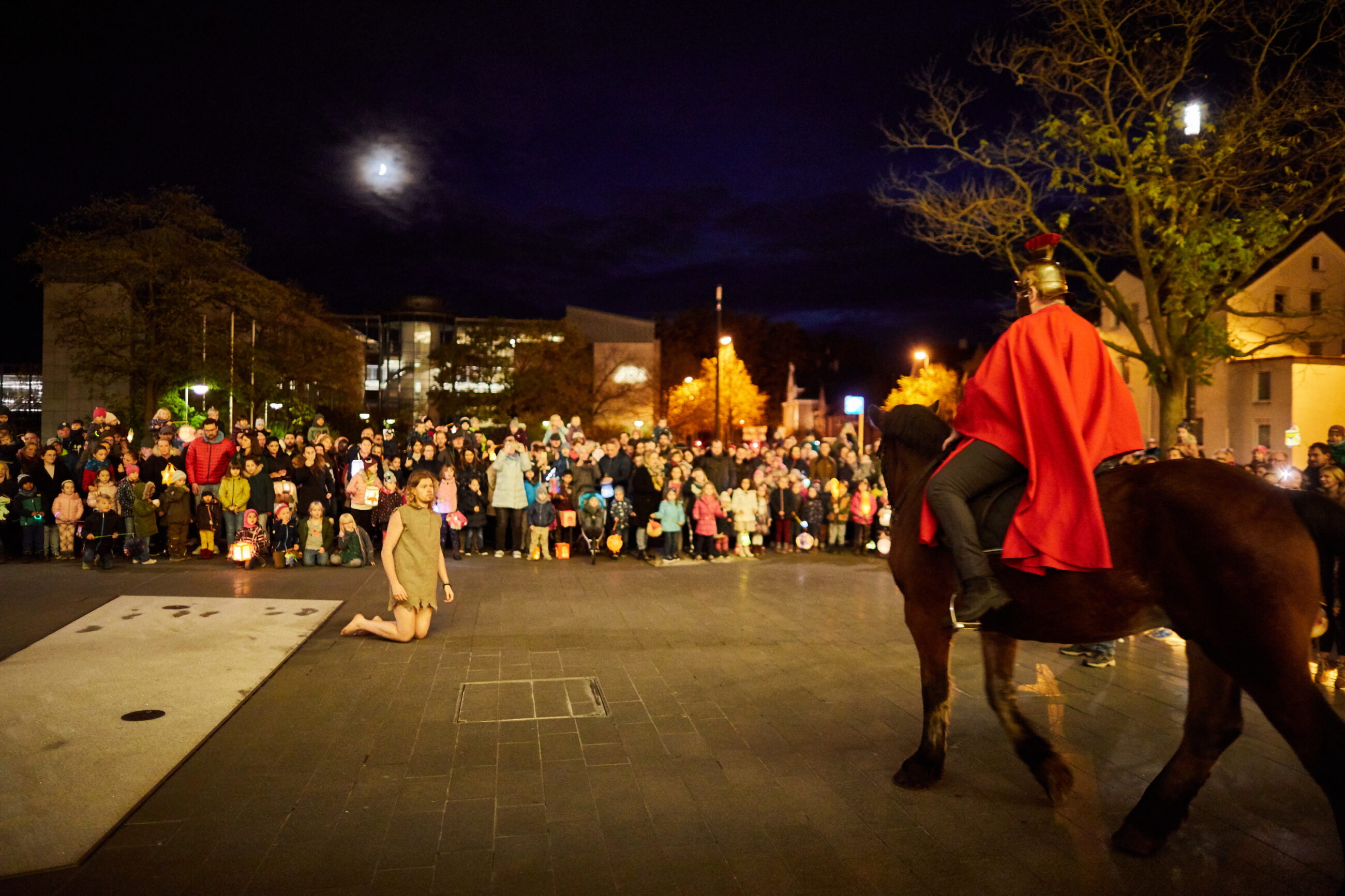 BU: Nach wie vor beliebt: Die Darstellung der Mantelteilung des Heiligen Sankt Martin zum Abschluss des Laternenumzugs. Foto: Kai Uwe Oesterhelweg