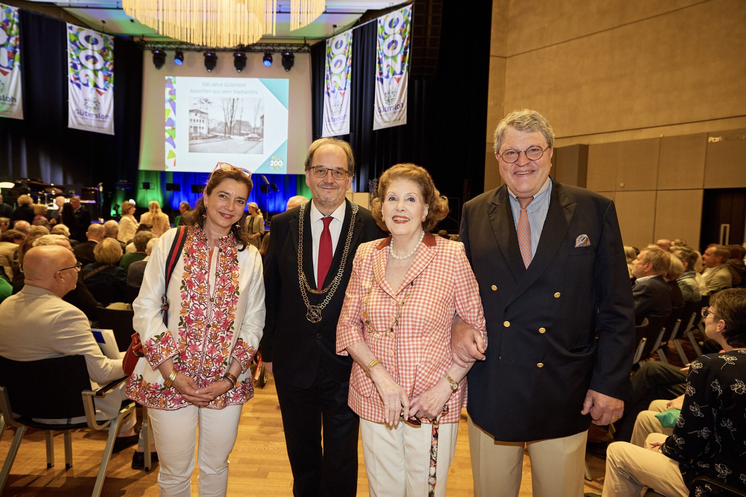Güterslohs Bürgermeister Matthias Trepper traf Dr. Karin Zinkann (beide mittig) zuletzt am 18. Mai in der Gütersloher Stadthalle beim Festakt zum 200-jährigen Jubiläum der Stadt, wo er die von ihr mitgestaltete und von der Familie Zinkann gestiftete Bürgermeisterkette trug. Gemeinsam mit ihrem Sohn Dr. Reinhard Zinkann (ganz rechts) und ihrer Schwiegertochter Amélie Geva Zinkann (ganz links) nahm Karin Zinkann als Ehrengast an der Veranstaltung teil. Foto: Stadt Gütersloh / Kai Uwe Oesterhelweg