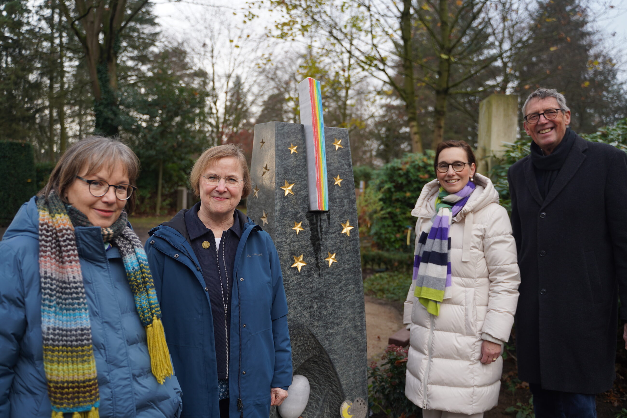 Ein Gedenkstein für still geborene Kinder: v.l. Susanne Laab (Leitung des Evangelischen Friedhofs), Annette Kleine (Pfarrerin für Krankenhausseelsorge in Gütersloh) Katrin Meyer (Vorstandsvorsitzende der Bürgerstiftung Gütersloh) und Peter König, (Presbyter der Ev. Kirchengemeinde Gütersloh) haben sich für einen Ort stark gemacht, an dem Eltern um ihre Kinder trauern dürfen.