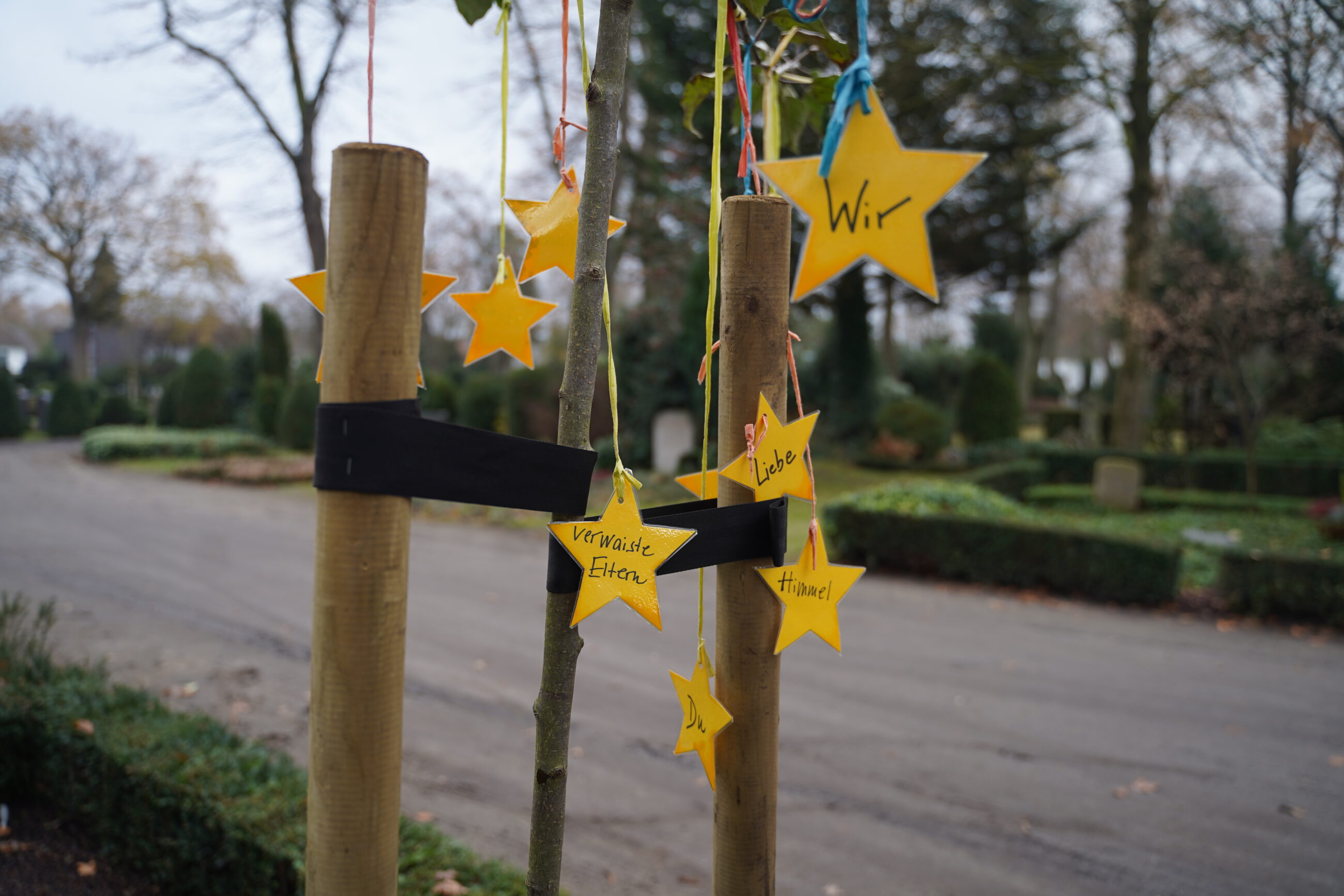 Der Bildhauer hat einen alten Granitstein, der in den Besitz des Friedhofs übergegangen war, zu einem zeitgemäßen Kunstwerk umgearbeitet: Mit goldenen Sternen, die schon von weitem leuchten. Ein bunter Regenbogen weist zum Himmel hin, und der Psalmvers auf der Rückseite fasst es in Worte: „Gott heilt die zerbrochenen Herzen. Er zählt die Sterne und nennt sie alle mit Namen“.