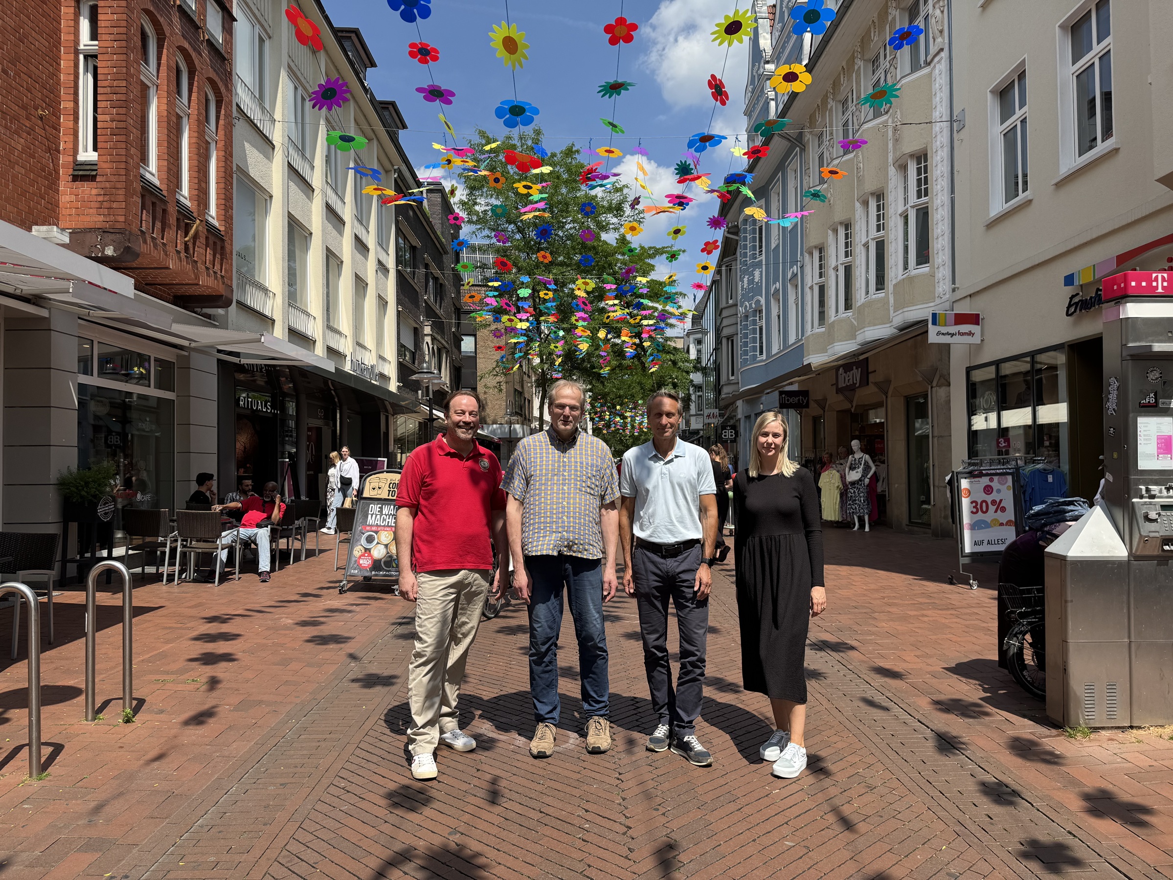 v.l.n.r.: Christopher Rascher-Friesenhausen, Christoph Fritzenkötter und Peter Oesterhelweg aus dem Vorstand der ISG Mittlere Berliner Straße freuen sich mit Clara Abelmann, Leitung City- und Tourismusmanagement der gtm, über die diesjährige Sommerdekoration. (Copyright: Gütersloh Marketing)