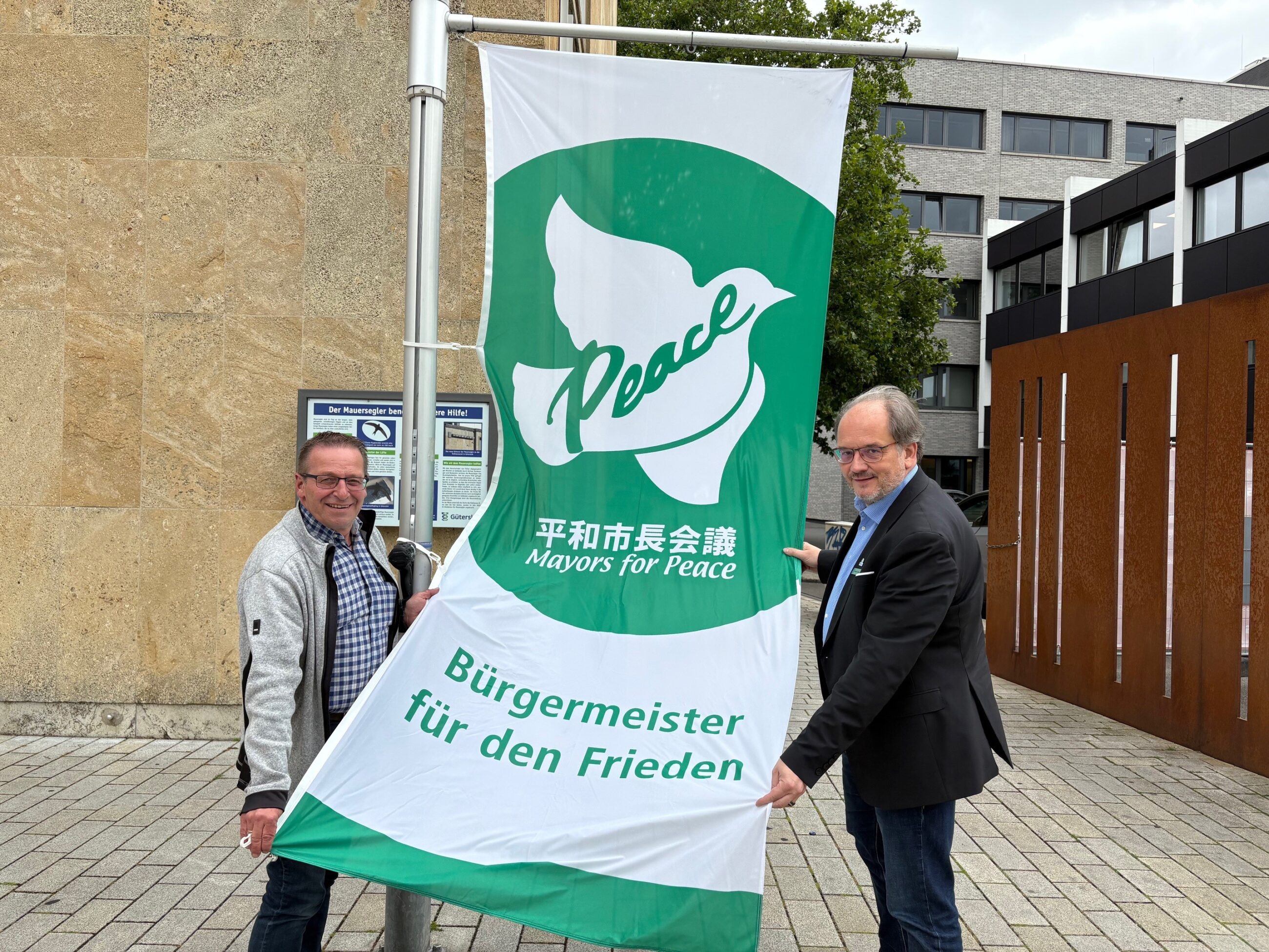 Zusammen mit Ralf Manche (Fachbereich Bauverwaltungsservice) hisst Bürgermeister Matthias Trepper die Fahnen zur Initiative „Mayors for Peace“. Foto: Stadt Gütersloh