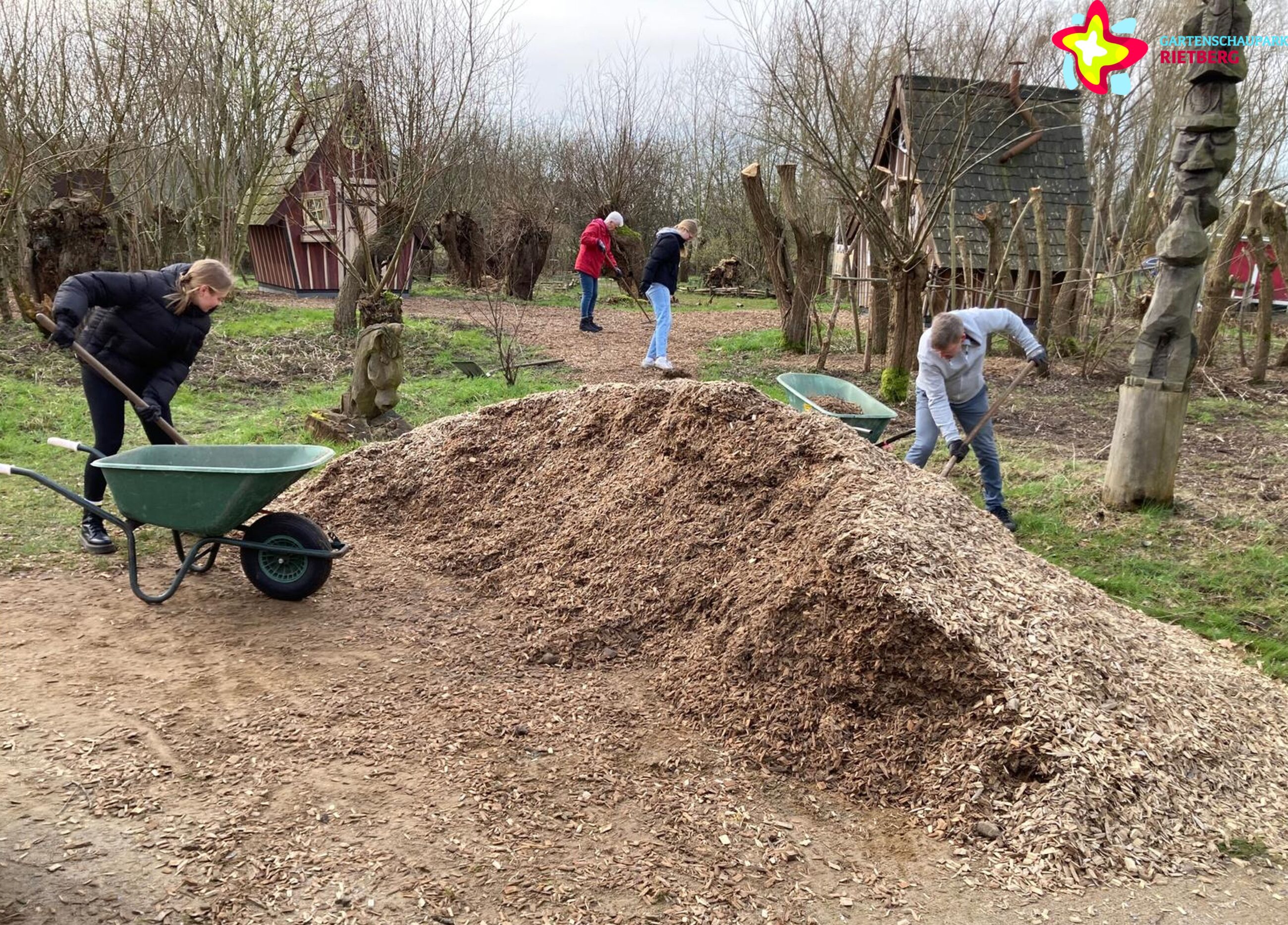 Foto: Helfende Hände gerne gesehen: Im Vorjahr lag einer der Schwerpunkte der Parkpflegeaktion auf dem Bereich rund um die Hexenhäuschen. In diesem Jahr rücken die neue Staudengalerie, die Spielplätze und die Minigolfanlage in den Blick. Foto: Gartenschaupark Rietberg GmbH.