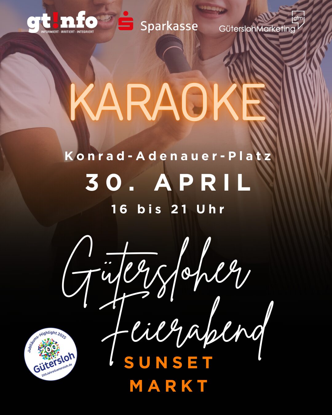 Nach der gelungenen Premiere Ende März, findet am Mittwoch, den 30. April der zweite „Gütersloher Feierabend – Sunset Markt“ auf dem Konrad-Adenauer-Platz statt. Dieses Mal steht der Abendmarkt unter dem Motto „Karaoke“: Moderator und Karaoke-Profi Maik Hebel von MaikCheck Karaoke Services gibt Gesangstalenten die Chance, die Bühne zu erobern und unterstützt sie mit professioneller Bühnentechnik und einer umfangreichen Song-Bibliothek von über 60.000 Liedern. Alle Sänger*innen bekommen nach ihrem Auftritt eine kleine Belohnung.