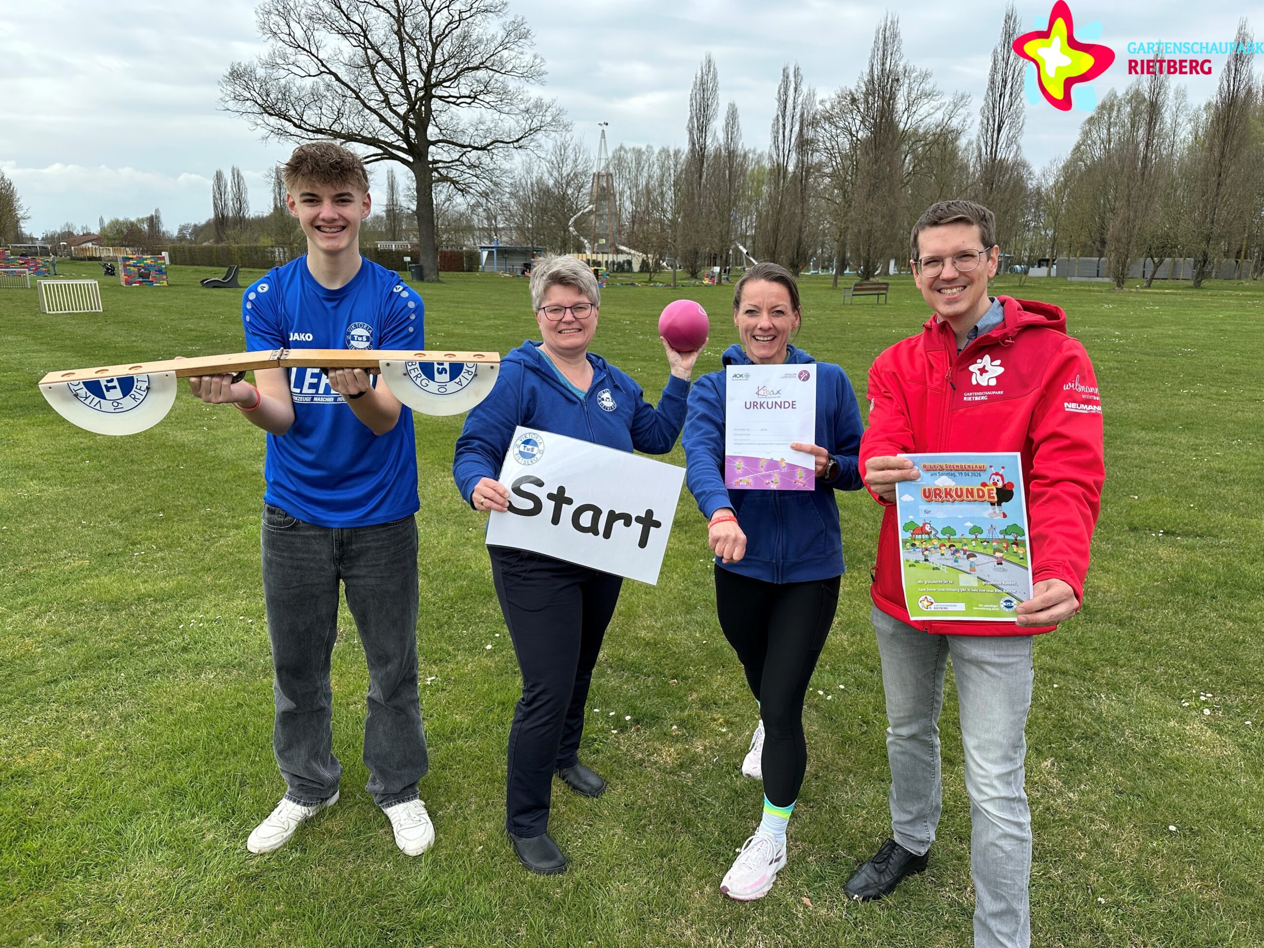 Foto: Sie freuen sich aufs Familienfrühlingsfest und die zweite Auflage von Rietis Spendenlauf (von links): Emil Nöcker, Silvia Edenfeld und Jessica Nöcker (alle TuS Viktoria Rietberg) und Gartenschaupark-Geschäftsführer Johannes Wiethoff. Foto: Stadt Rietberg