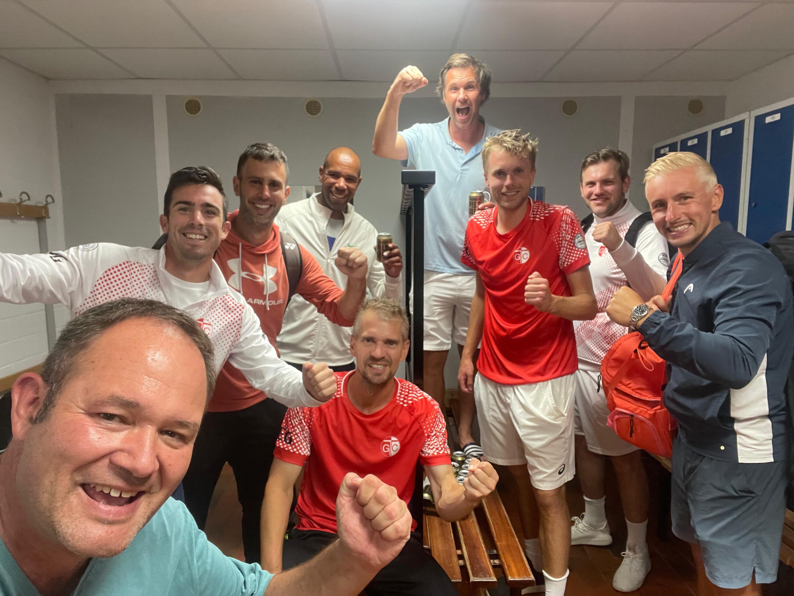 Jubel über den Klassenerhalt in der Kabine in Köln: die GTC-Herren30-Mannschaft um Kapitän Bernd Eggers (v.l.)
