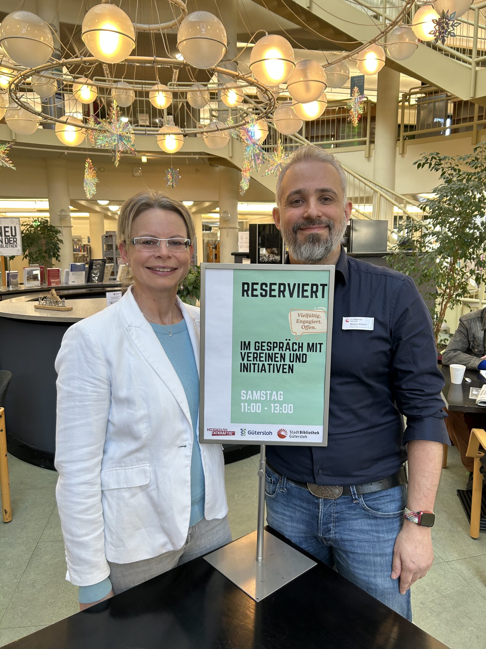 Ehrenamtskoordinatorin der Stadt Gütersloh, Elke Pauly-Teismann und Michele Wegner, Teamleiter Programmarbeit/Veranstaltungen der Stadtbibliothek Gütersloh, freuen sich auf den zweiten Termin des Austauschs mit Gütersloher Vereinen in der Stadtbibliothek.