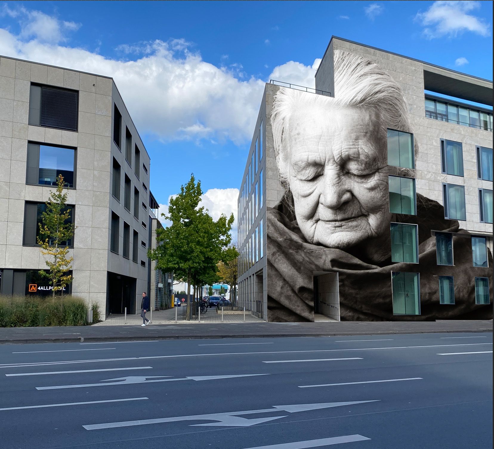 Das Portrait an der Volksbank zeigt Sabine Gramlich (1913–2004), eine Gütersloher Friedensaktivistin, die in diesem Jahr mit einer Gedenktafel geehrt werden soll. Foto Detlef Güthenke