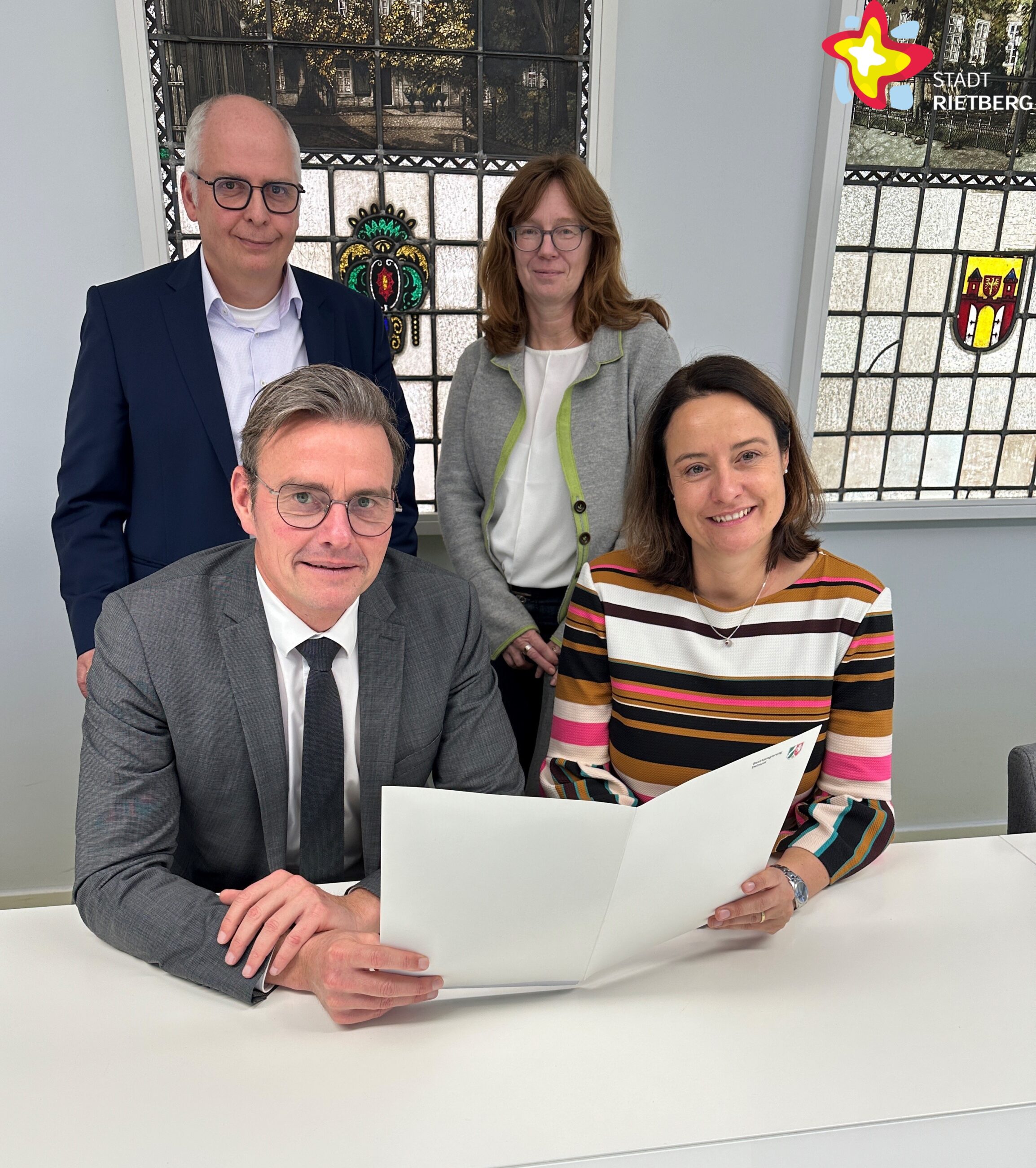Foto: Einen Förderbescheid mit Landesmitteln überbrachte Regierungspräsidentin Anna Katharina Bölling dem Rietberger Bürgermeister Andreas Sunder, hier im Bild mit dem Fachbereichsleiter Bauen Matthias Setter (hinten links) und Abteilungsleiterin Heike Bennink (hinten, rechts). Foto: Stadt Rietberg