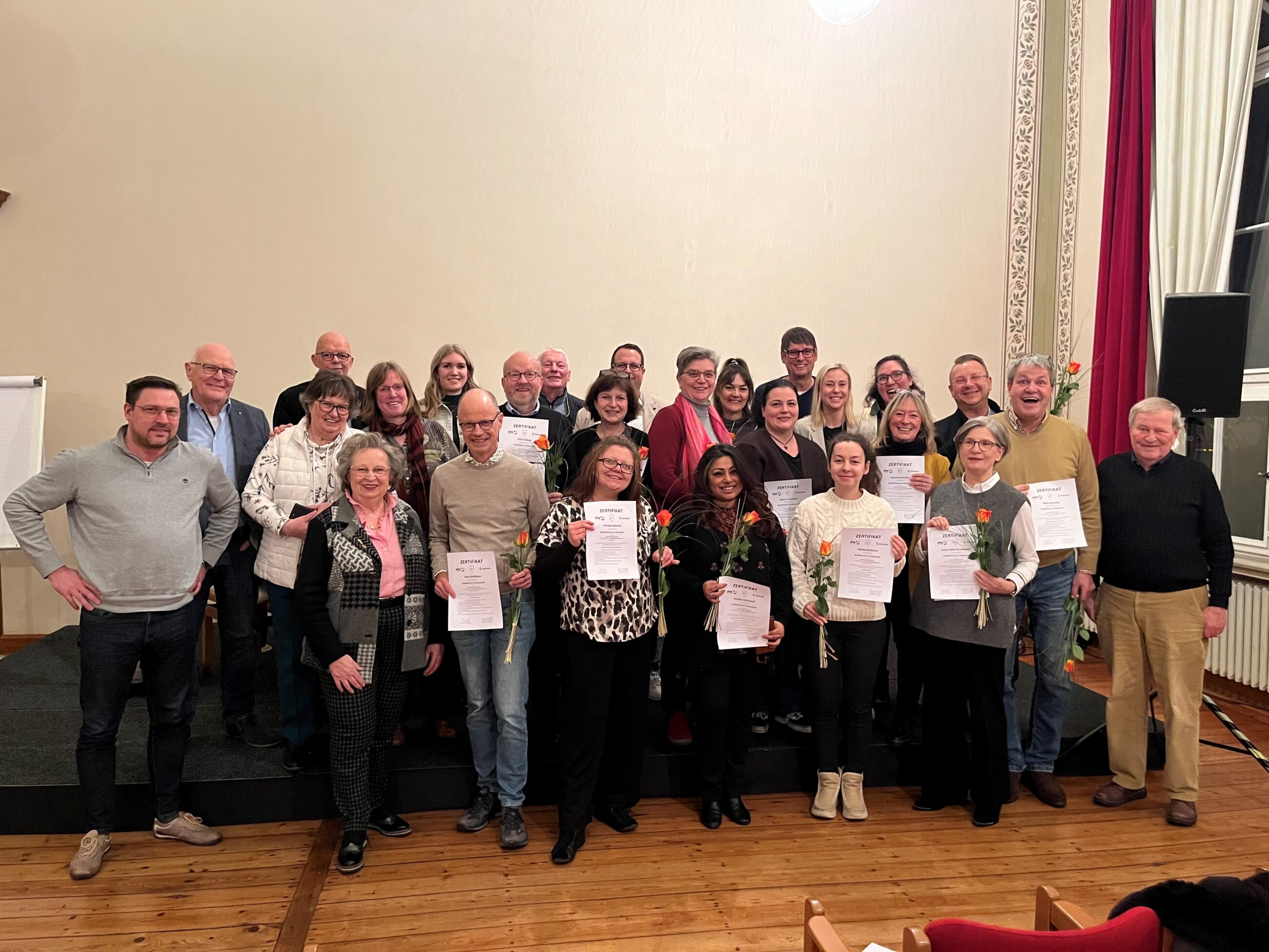 Alle 15 Teilnehmer*innen haben die Abschlussprüfung erfolgreich bestanden und erhielten am 10. Februar 2025 im Rahmen einer Abschlussfeier ihr Zertifikat: „Die Ausbildung war ein voller Erfolg! Wir haben nicht nur viele spannende und kreative Konzepte entwickelt, sondern auch eine unglaublich engagierte und harmonische Gruppe von neuen Stadtführer*innen gewonnen. Besonders freut mich, wie großartig das Zusammenspiel mit unserem bestehenden Stadtführer*innen-Team funktioniert – alle unterstützen sich gegenseitig und bringen eigene Impulse ein. Das ist der perfekte Grundstein für ein vielseitiges und lebendiges Führungsangebot in Gütersloh.“, sagt Clara Abelmann. Das bestehende Stadtführer*innen-Team ließ es sich nicht nehmen, den Absolvent*innen mit kleinen Dankesreden zu gratulieren. Auch die neuen Stadtführer*innen bedankten sich für die gelungene Ausbildung und die Unterstützung durch das Team und die Dozent*innen.