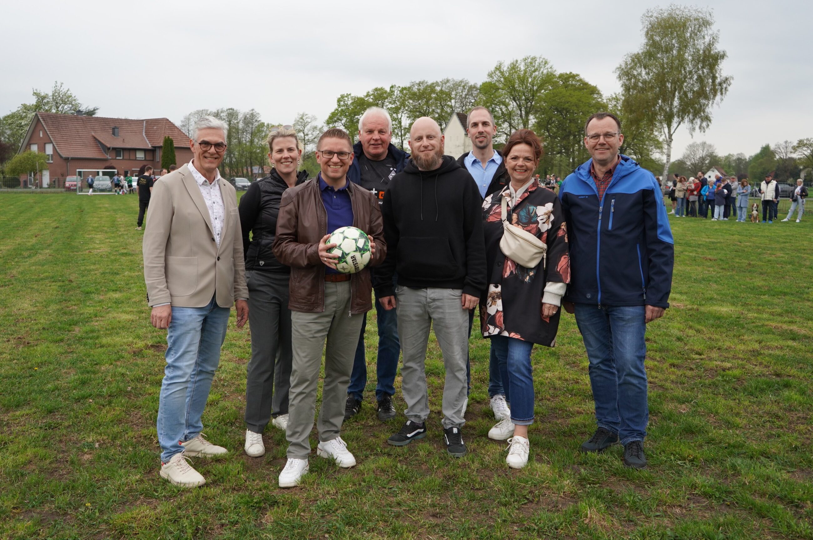 Bolzplatzeröffnung in Österwiehe: (v.l.n.r.) Frank Jacobeit (Fachbereichsleiter Tiefbau), Martina Heitvogt (Fachbereichsleiterin Bildung, Sport und Kultur), Bürgermeister Robin Rieksneuwöhner, Alfons Sagemüller, Manuel Begenat (Fachbereich Jugend), Marcel Lausch (Bauhofleiter), Gabriele Nitsch (Vorsitzende des Ausschusses für Bildung, Sport, Kultur und Generationen) und Andreas Westermeyer.