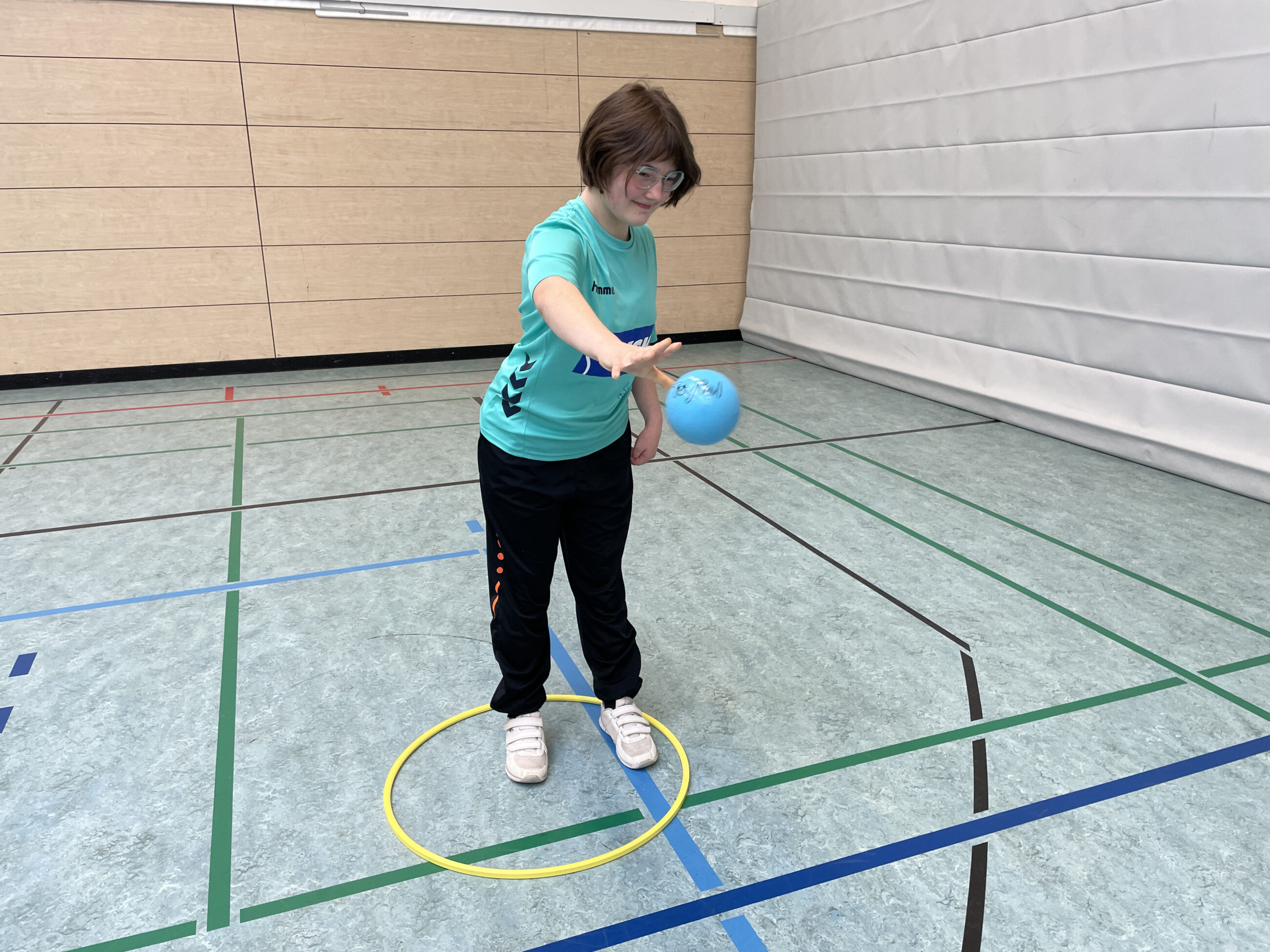 BU Boccia Emma: Boccia war der Favorit der 14-jährigen Emma. Sie braucht Unterstützung beim sicheren Gehen und Stehen und konnte den Tag nutzen, um in die unterschiedlichen, inklusiven Sportangebote der Vereine hinein zu schnuppern. Foto: Stadt Gütersloh