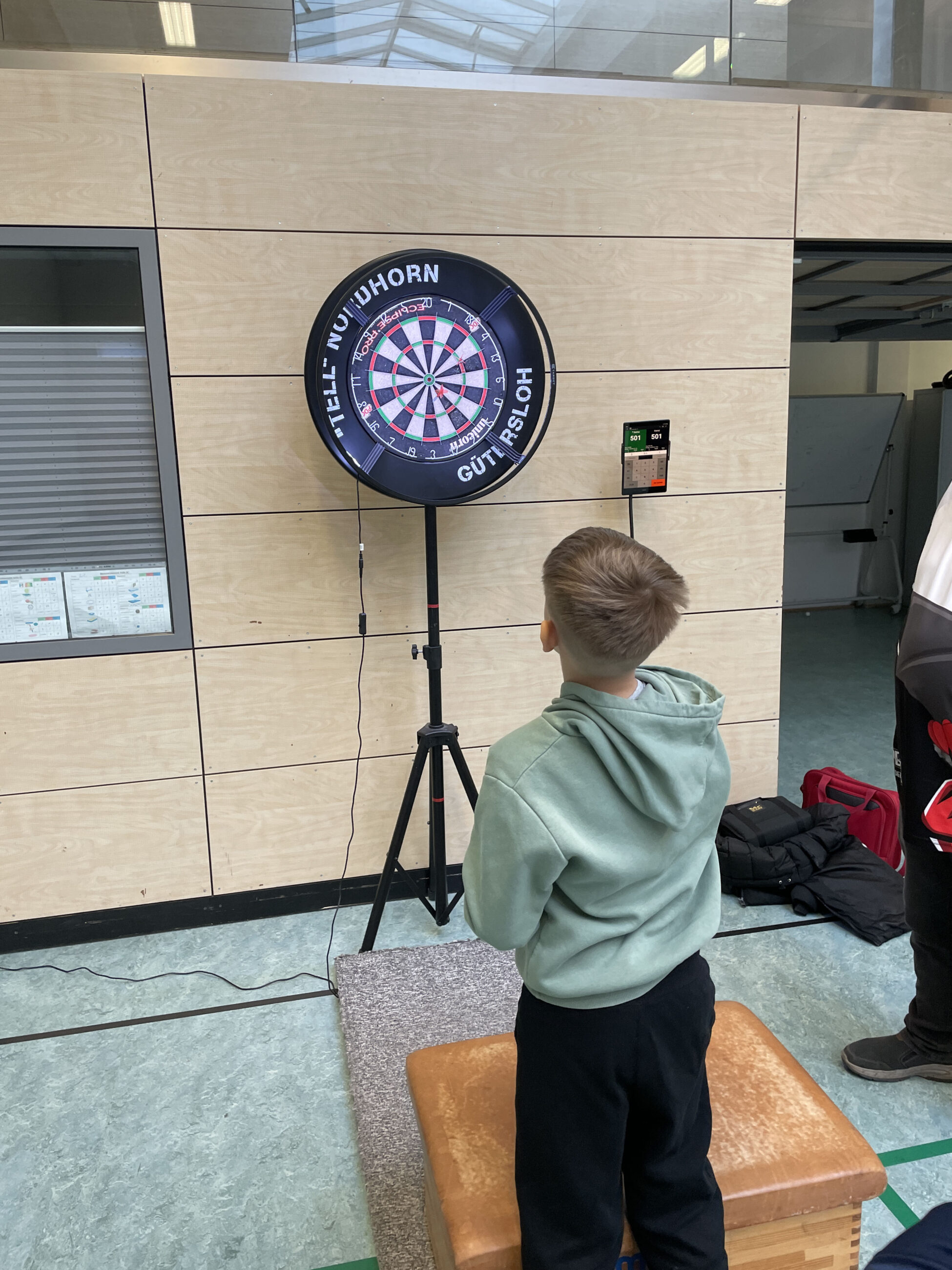 BU Darts_Leo: Der 7-jährige Leo hat beim „Sporttag – inklusiv und für jeden“ einiges ausprobiert. Am besten gefallen hat ihm Darts. Foto: Stadt Gütersloh