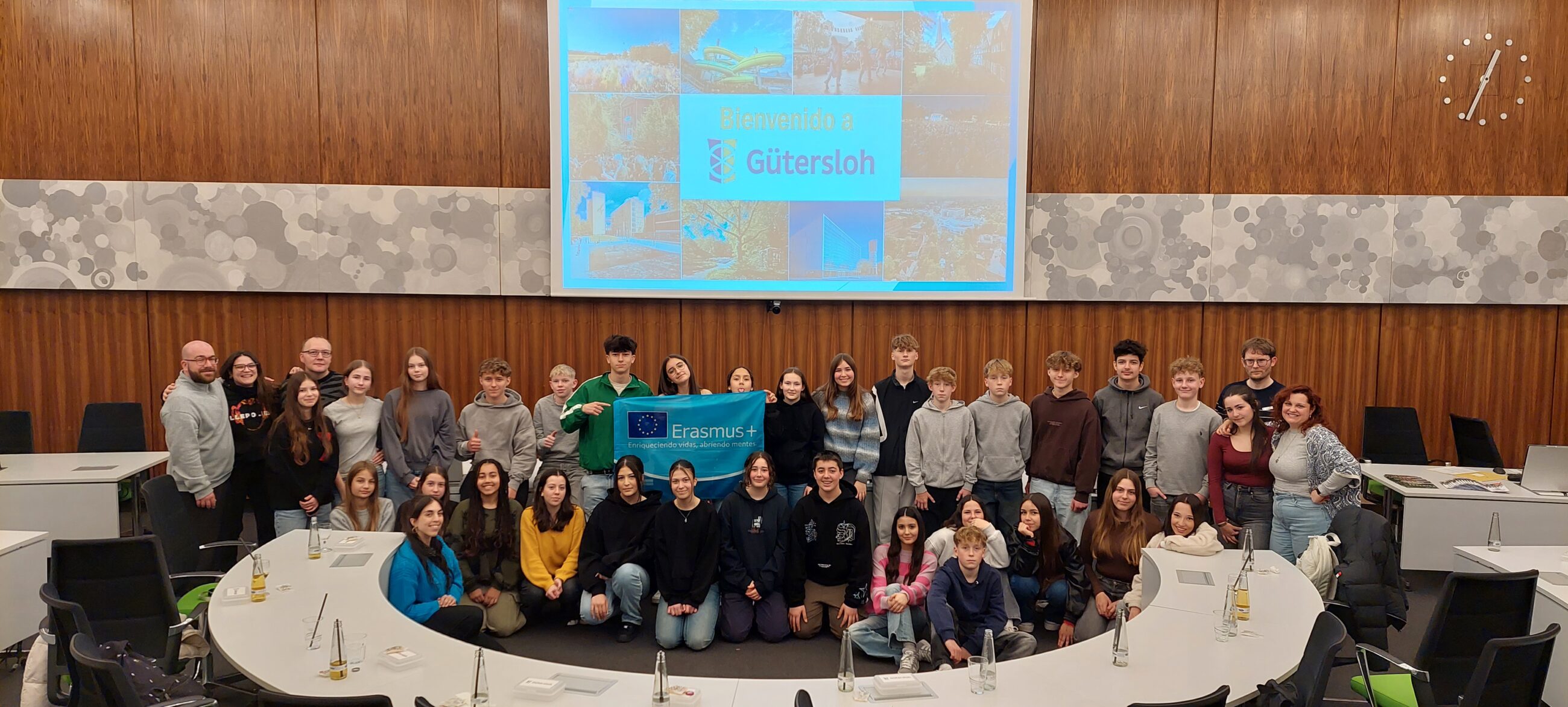 BU Gruppenfoto Droste-Haus_Städt. Gymn. Sant Celoni: „Soziale Medien und mentale Gesundheit“ war das Thema des EU-geförderten Austauschs zwischen einer Schule aus der spanischen Stadt Sant Celoni und dem Städtischen Gymnasium Gütersloh in Kooperation mit dem Droste-Haus Verl. Die knapp 40 Jugendlichen besuchten Bürgermeister Matthias Trepper im Ratssaal und wurden unter anderem begleitet von Bianca Gallardo Gomez (Bildungsreferentin beim Droste-Haus) und Sina Clarenbach (Lehrerin am Städtischen Gymnasium). Foto: Stadt Gütersloh