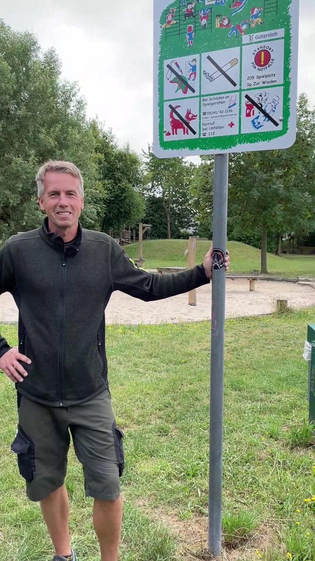 Für die Sicherheit der Gütersloher Spielplätze sorgt Alexander Lewike gemeinsam mit seinen Kolleginnen und Kollegen vom Fachbereich Grünflächen der Stadt Gütersloh. Er erklärt: Auf den Schildern am Spielplatz stehen alle wichtigen Informationen für den Notfall. Foto: Stadt Gütersloh