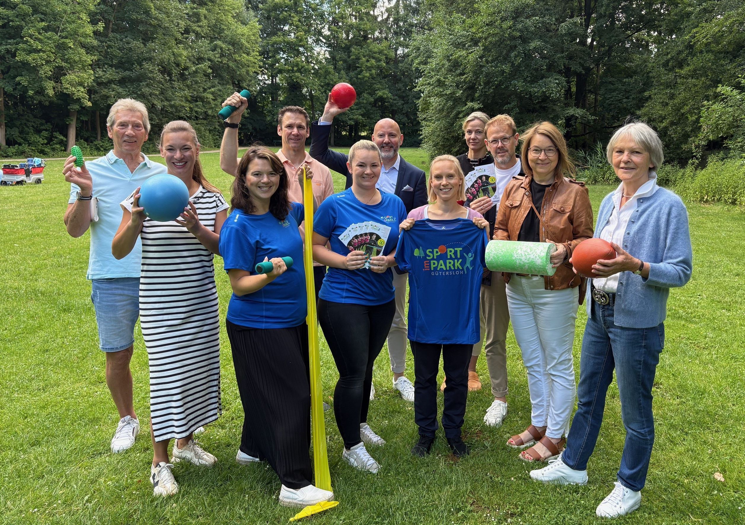 Organisatoren und Förderer freuen sich gemeinsam über das umfang- und abwechslungsreiche Programm der zehnten Auflage „Sport im Park“: Erhard Galetzka (Vorstand Seniorenbeirat), Karina Wiemann (Volksbank in Ostwestfalen), Vanessa Moutogeorgos (Kreissportbund Gütersloh) , Frank Papesch (AOK NordWest) , Jennifer Jones (Kreissportbund), Henning Matthes (Beigeordnete für den Bereich Sport), Britta Thieme (Fachbereich Sport), Gode-Marie Quast-Hohenhorst (Vorstand Stadtsportverband), Dirk Buddenberg (Leitung Fachbereich Grünflächen), Nina Spallek (Bürgerstiftung Gütersloh), Monika Paskarbies (Vorstand Kreissportbund). Foto: Stadt Gütersloh