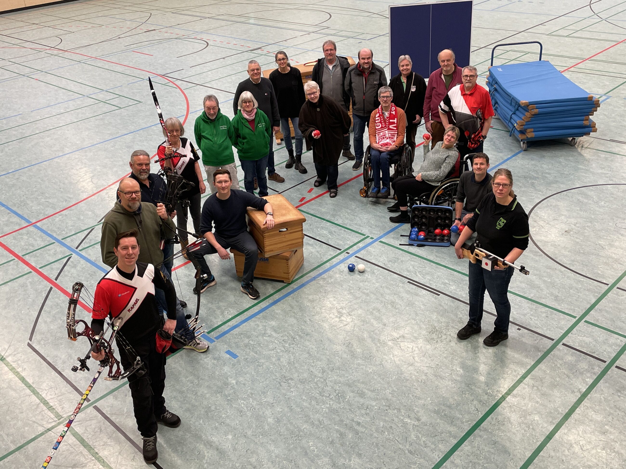 BU: Die Freiweilligen der teilnehmenden Vereine 1. FC Isselhorst, TV Isselhorst, GTV, SV Pavenstädt, SVA Gütersloh, GRSV, GTSV23, DJK Rheda, Schützenverein „Tell“ Nordhorn und CVJM freuen sich beim „Sporttag inklusiv und für jeden“ in der Innenstadtsporthalle C ihre Sportarten vorstellen zu dürfen. Foto: Stadt Gütersloh