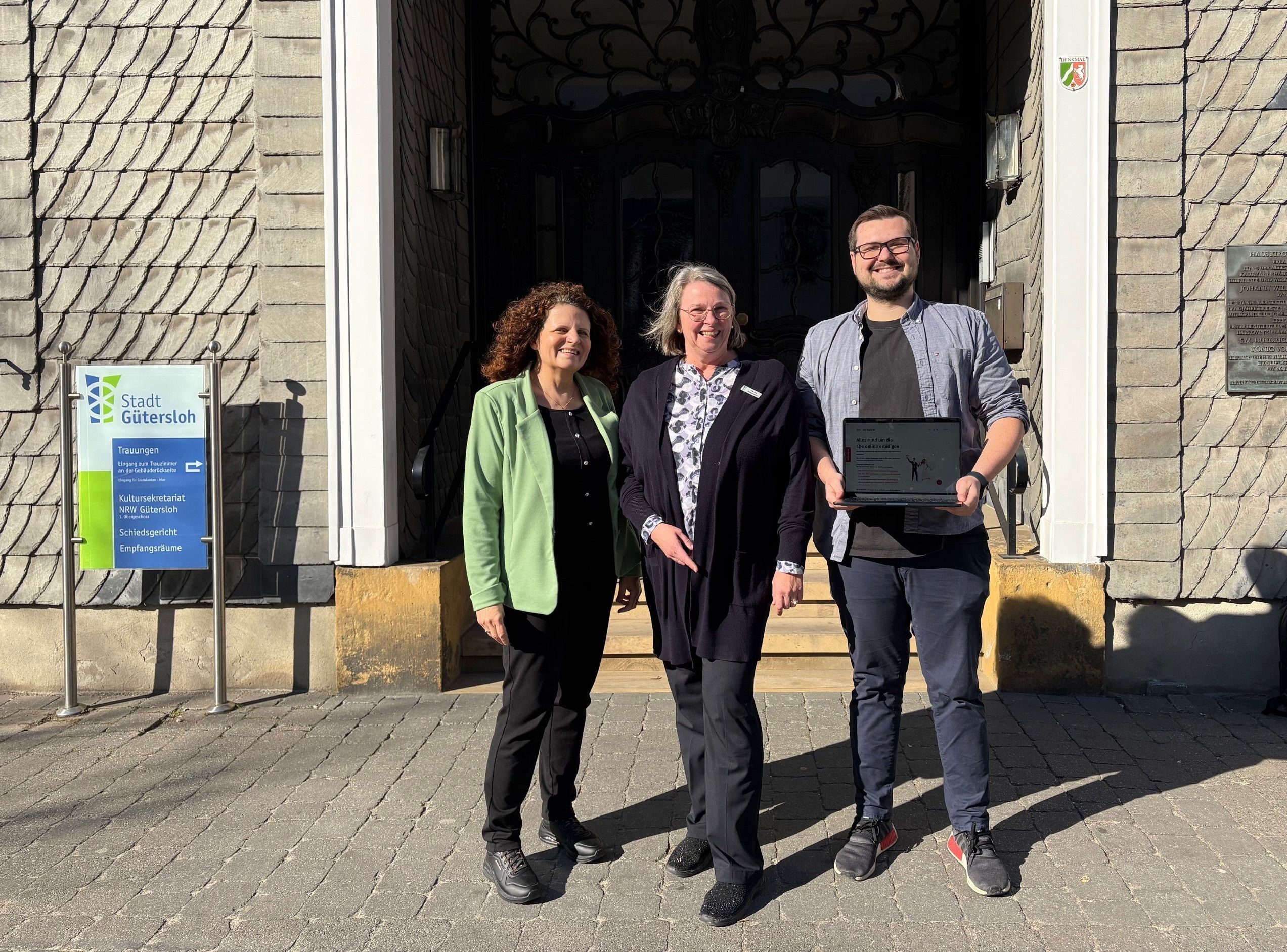 BU: (v.l.) Manuela Marxen (Standesbeamtin), Claudia Wiegelmann (Leitung Standesamt) und Pascal Stewin (Fachbereich Digitalisierung und Geoinformation) freuen sich, das neue Angebot auch in Gütersloh anbieten zu können. Foto: Stadt Gütersloh