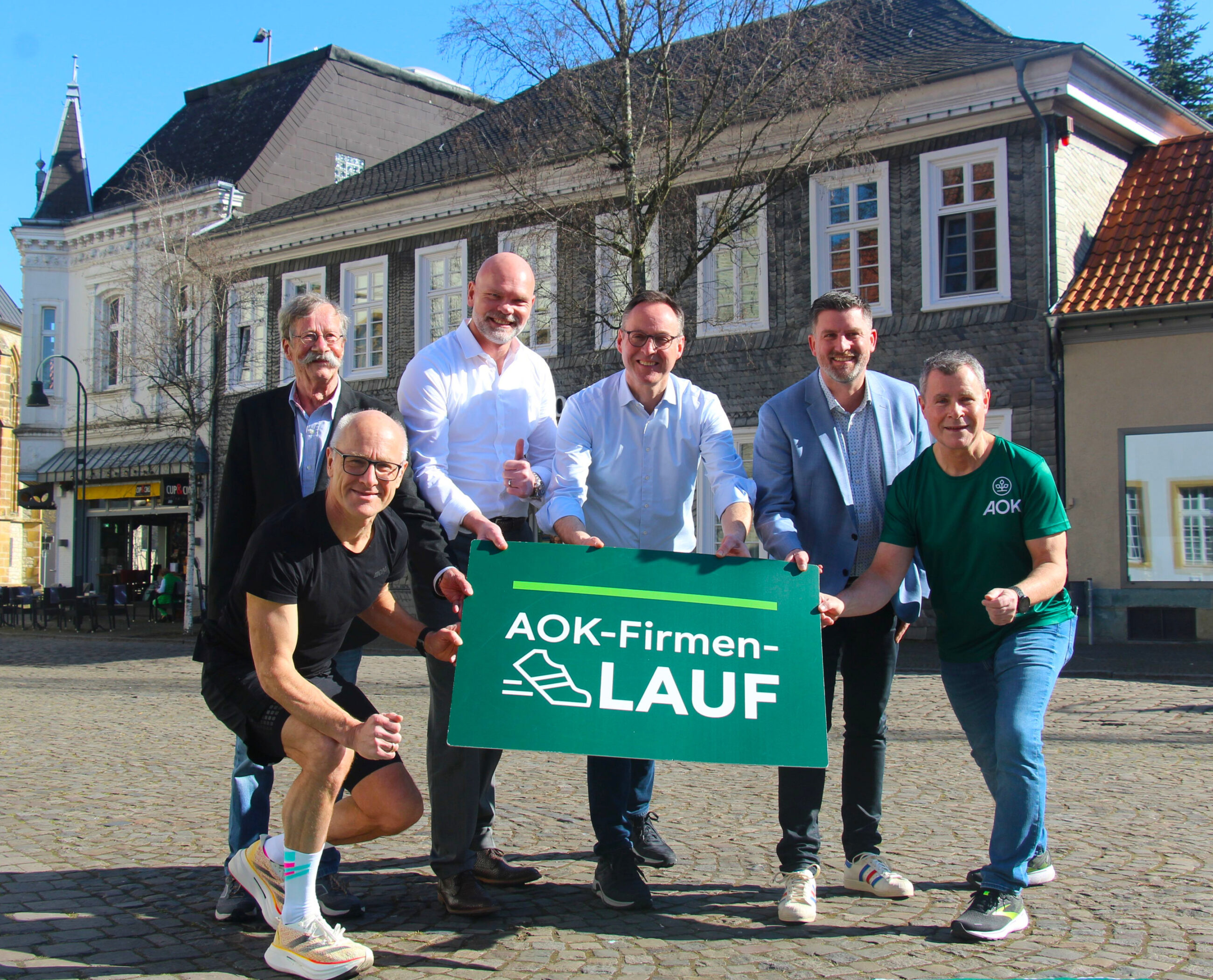 (von li.): Ab sofort bis zum 22. Mai nehmen die Organisatoren des 13. AOK-Firmenlaufes Wiedenbrück Anmeldungen unter www.firmenlauf-wiedenbrueck.de entgegen (von links vorne) Robert Becker (Veranstalter), Horst Pflüger (Homöopathisches Laboratorium Alexander Pflüger), Mario Frisch (Geschäftsführer navigator Gruppe), Theo Metterborg (Bürgermeister Wiedenbrück), Matthias Wehmhöner (Serviceregionsleiter AOK NordWest) und Uwe Kappner (Vertriebsmitarbeiter der AOK NordWest). Foto: AOK/hfr.