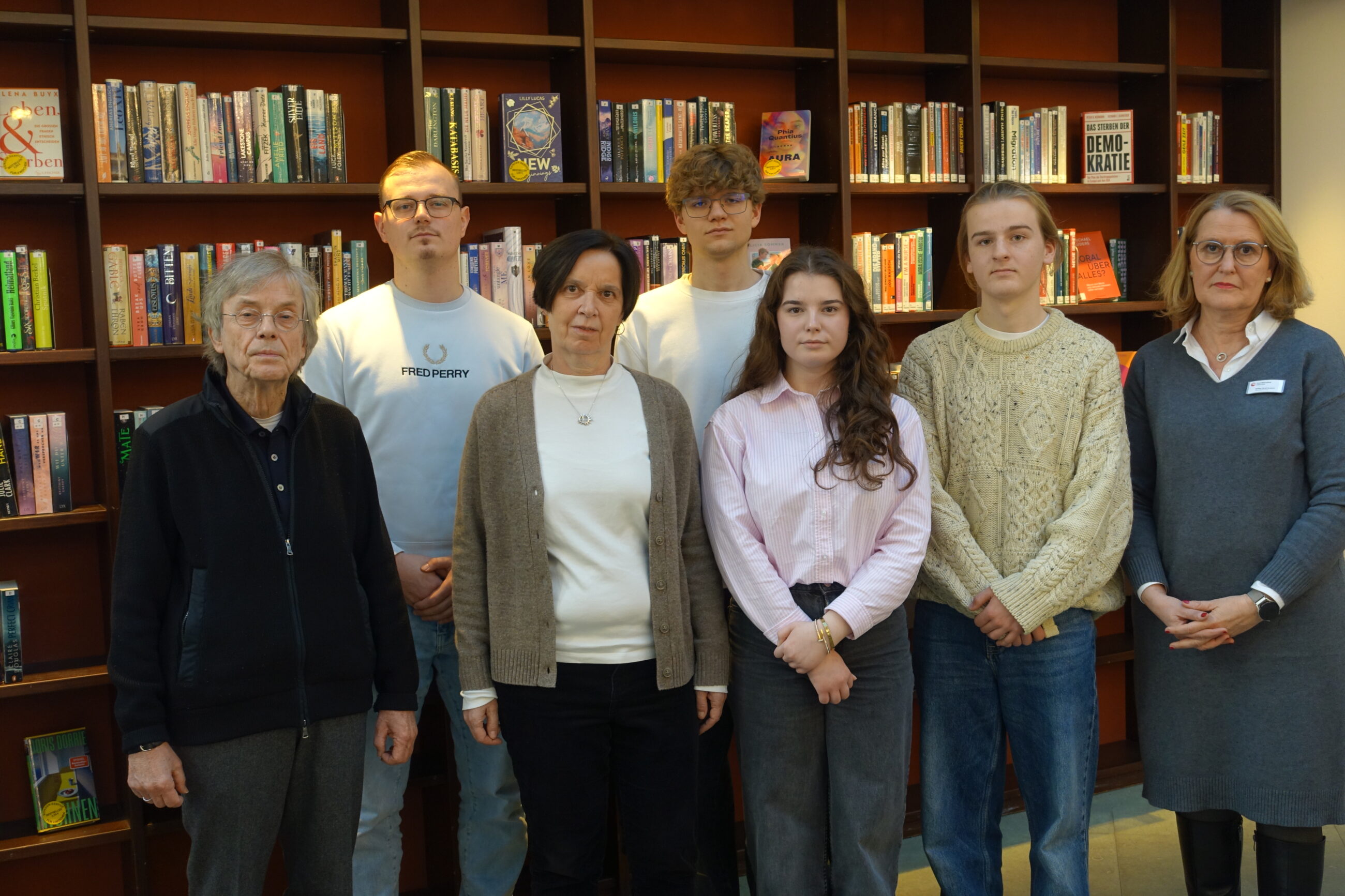 Laden zur Holocaust-Gedenkveranstaltung in die Stadtbibliothek Gütersloh ein: Dr. Siegfried Bethlehem, vom Städtischen Gymnasium Mirco Heidenreich, Britta Jünemann, stellvertretende Leiterin, Jan Witts, Loresa Buzolli, Ben Steuernagel, und Silke Niermann, Geschäftsführerin der Stadtbibliothek Gütersloh.