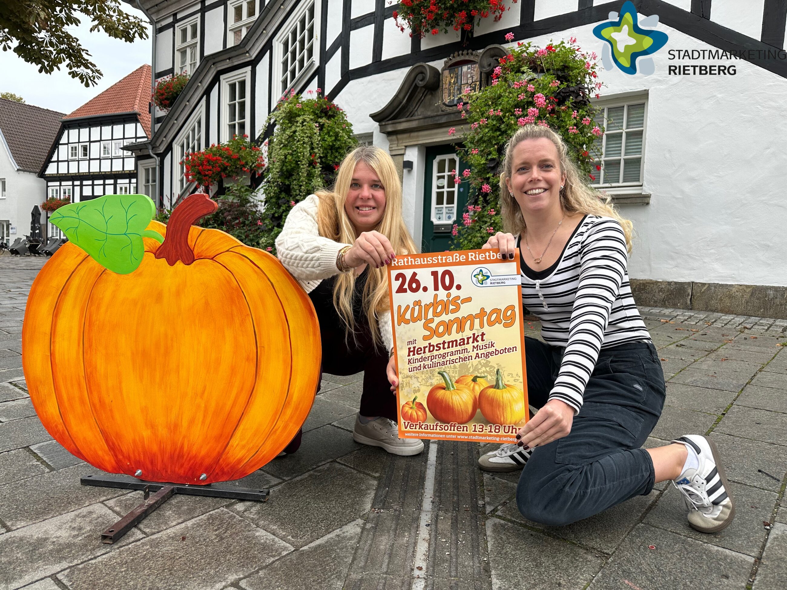 Foto: Bianca Piekatz (links) und Laura Hunke vom Stadtmarketing haben den Kürbissonntag organisiert und freuen sich auf viele Besucher in der Rietberger Innenstadt. Foto: Stadt Rietberg
