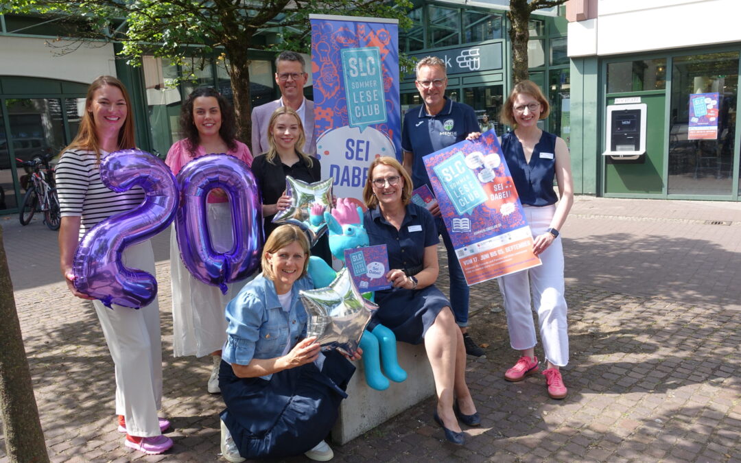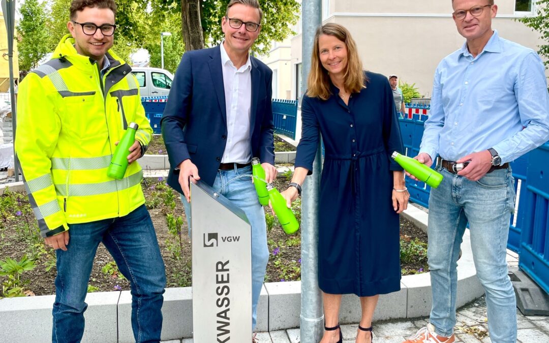 Freuen sich auf friedliches Feiern auf dem größten Dancefloor Güterslohs bei der vierten Auflage von DJs in Town: (v.l.) Lena Jeckel (Leitung Fachbereich Kultur), DJane Nuray Alkan, DJ Jonas Knemeyer, Henning Matthes (Erster Beigeordneter der Stadt Gütersloh) und Tim Burrows (Fachbereich Kultur).