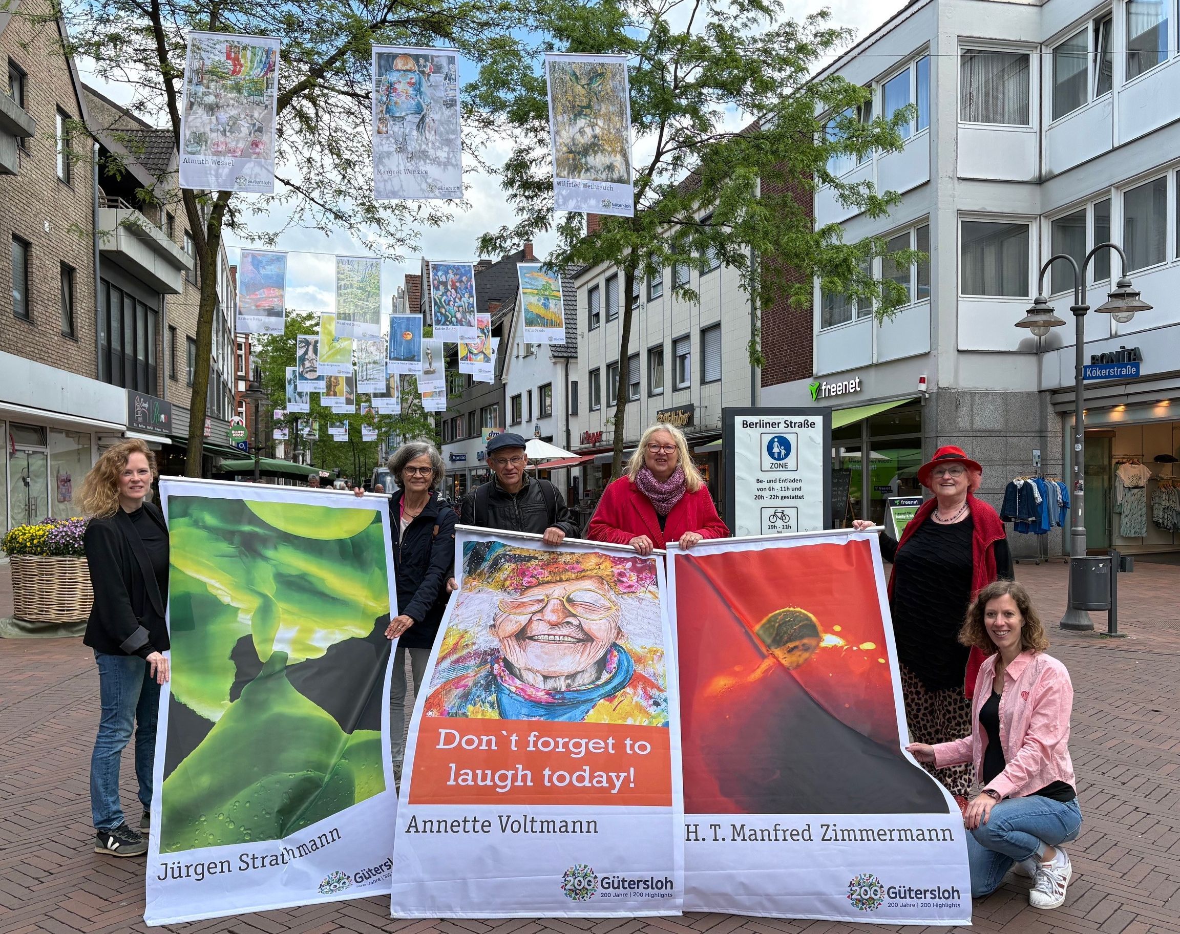 Gütersloh (gpr). Bunte Fahnen schmücken im Jubiläumsjahr die Gütersloher Fußgängerzone. Ab Montag 5. Mai, machen insgesamt 49 von unterschiedlichen bildenden Künstlerinnen und Künstlern gestaltete Fahnen deutlich, wie vielfältig die Künstlerszene des Kreises ist. Die persönlichen und individuell gestalteten Fahnen werden bis Mitte Juni wehen und die Innenstadt künstlerisch inszenieren. So vielfältig wie die Kunstszene sind auch die Motive und die Machart. Neben Malereien sind auch Fotografien oder Grafiken zu sehen.