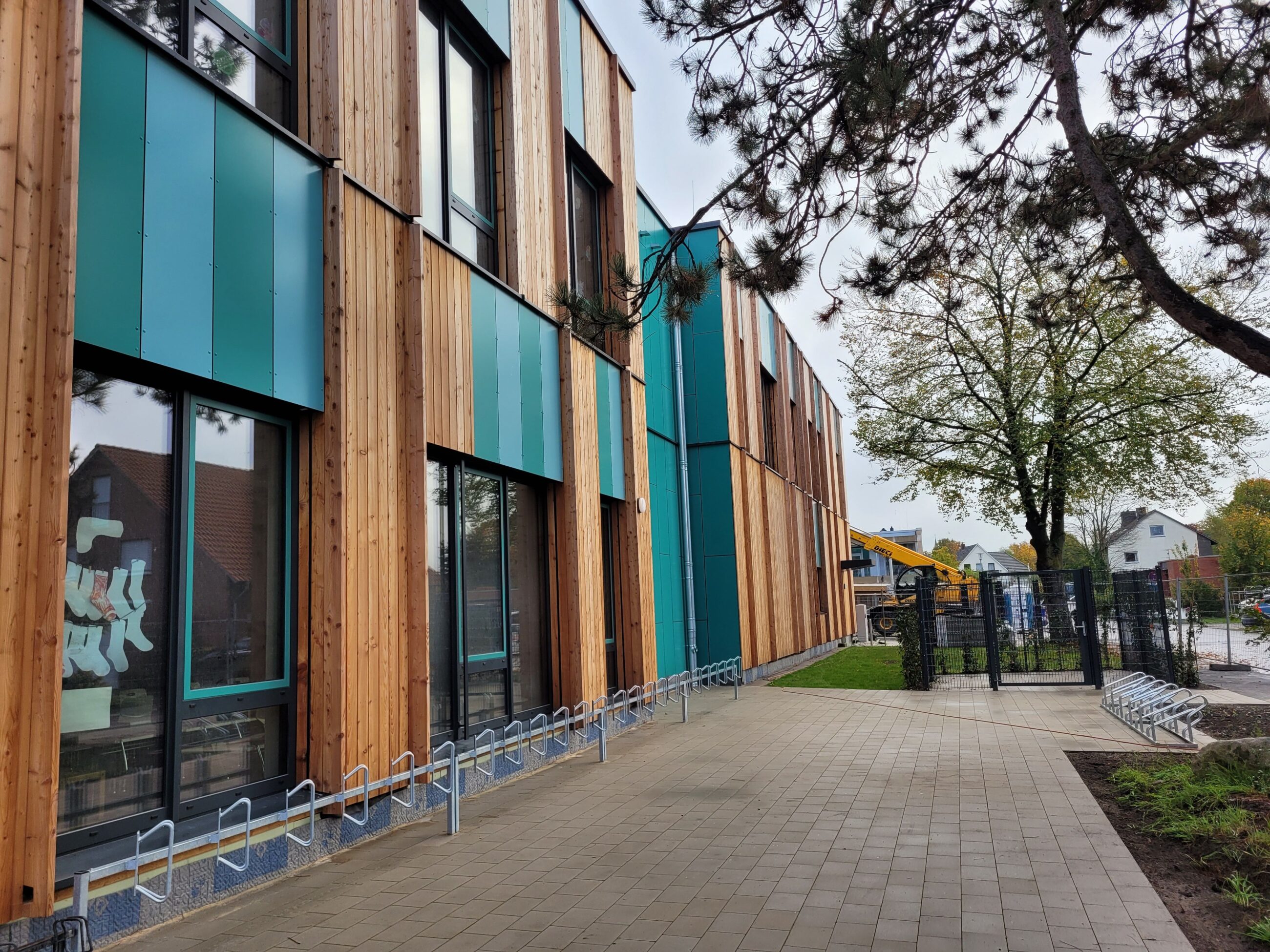 Die Fassade des neuen Schulgebäudes am Pelikanweg besteht aus Lärchenholz und farbigen Elementen. Foto: Stadt Gütersloh