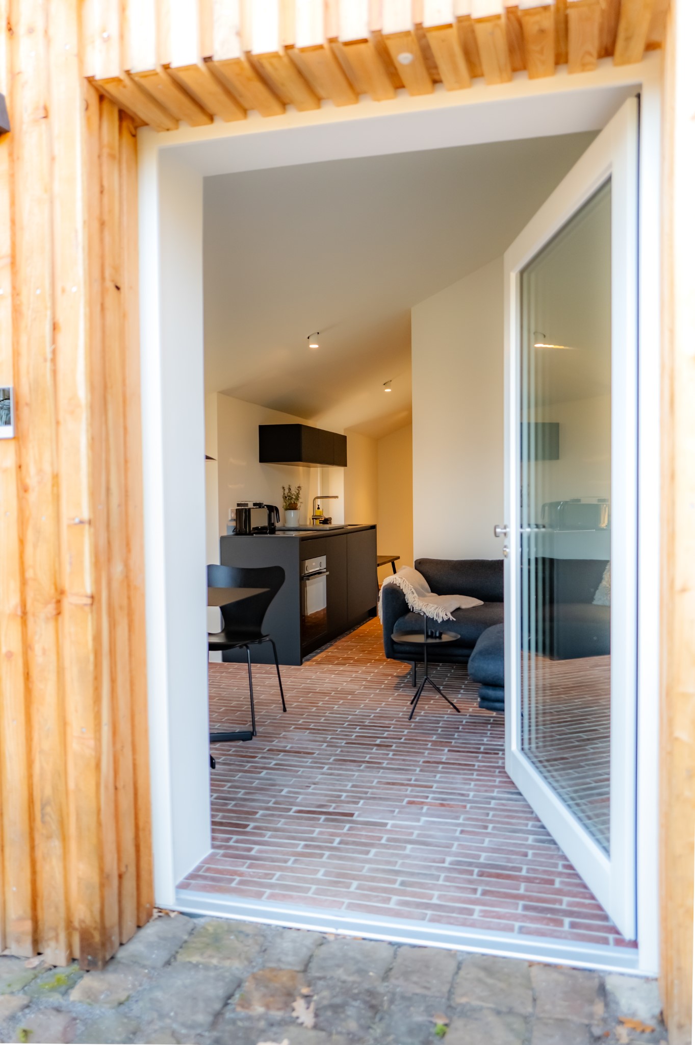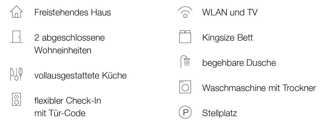 Alles ist da – man muss nur noch ankommen. Ein Schlüssel ist nicht nötig: Ein digitaler Türcode erlaubt flexible Anreise – zu jeder Tageszeit. Und dann? Ein Frühstück auf der eigenen Terrasse. Ein Glas Wein am Abend mit Blick ins Grüne. Ankommen. Durchatmen. Zuhause sein.