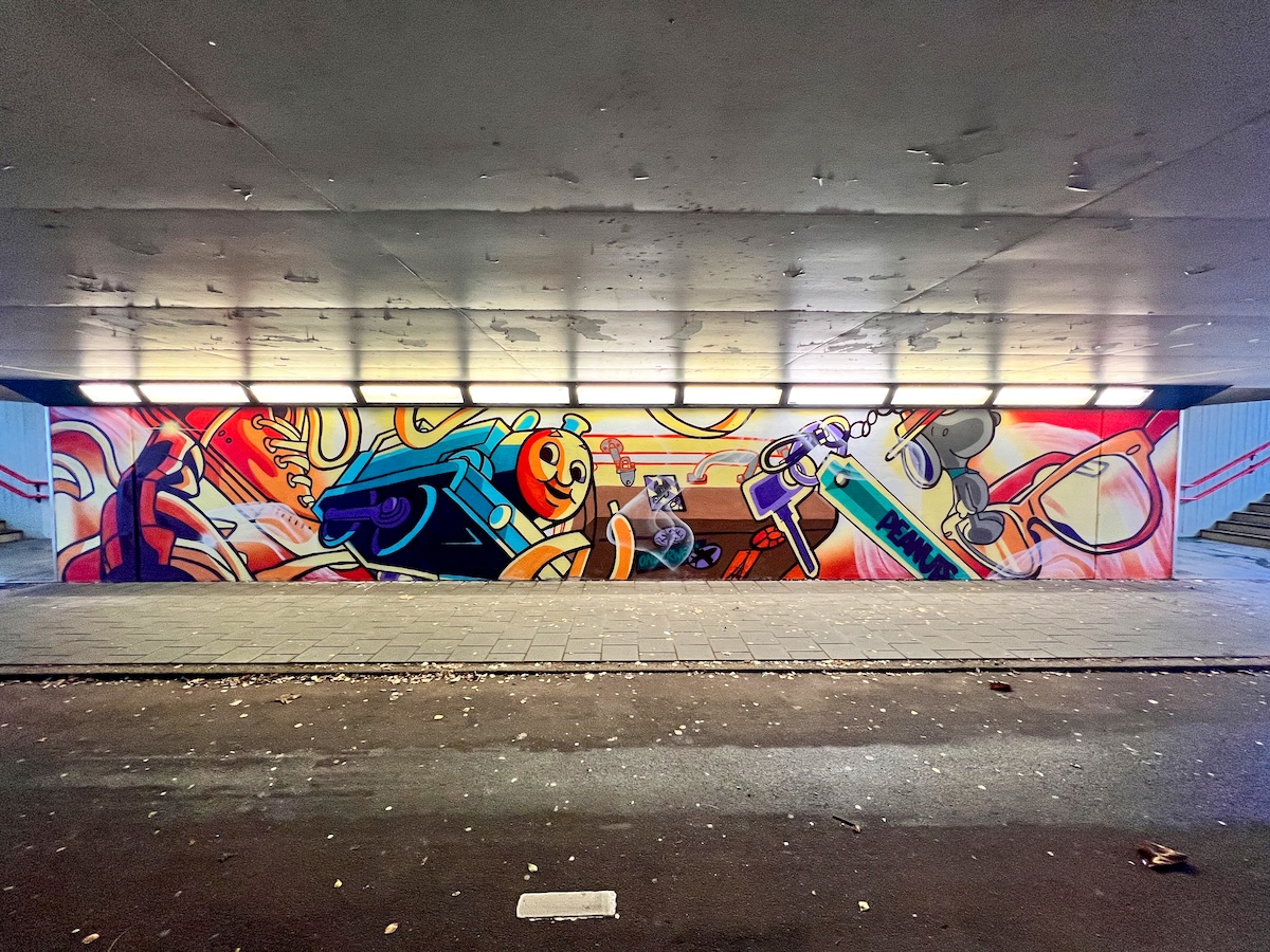 Diese Idee entstand nicht zufällig. In den Niederlanden hatte Caspar bereits ähnliche Projekte umgesetzt, unter anderem an einem Ort nahe dem Bahnhof von Veenendaal. Dort bezog er die Anwohner aktiv in seine Kunst ein. Er fragte sie, was sie mit dem Ort verbinden, welche Geschichten oder Gegenstände ihnen wichtig sind. Aus diesen Ideen entwickelte er gemeinsam mit den Menschen vor Ort ein Design, das anschließend umgesetzt wurde. Das Ergebnis: Die Menschen identifizierten sich mit dem Kunstwerk und sagten stolz: »Das ist unser Tunnel.« Genau dieses Gefühl möchte Caspar auch nach Gütersloh bringen – Kunst, die nicht nur von einem Künstler stammt, sondern gemeinsam mit der Stadt entsteht. Besonders wichtig ist ihm dabei, auch Schulen und Kinder einzubeziehen und jungen Menschen zu zeigen, dass sie ihre Umgebung kreativ mitgestalten können.