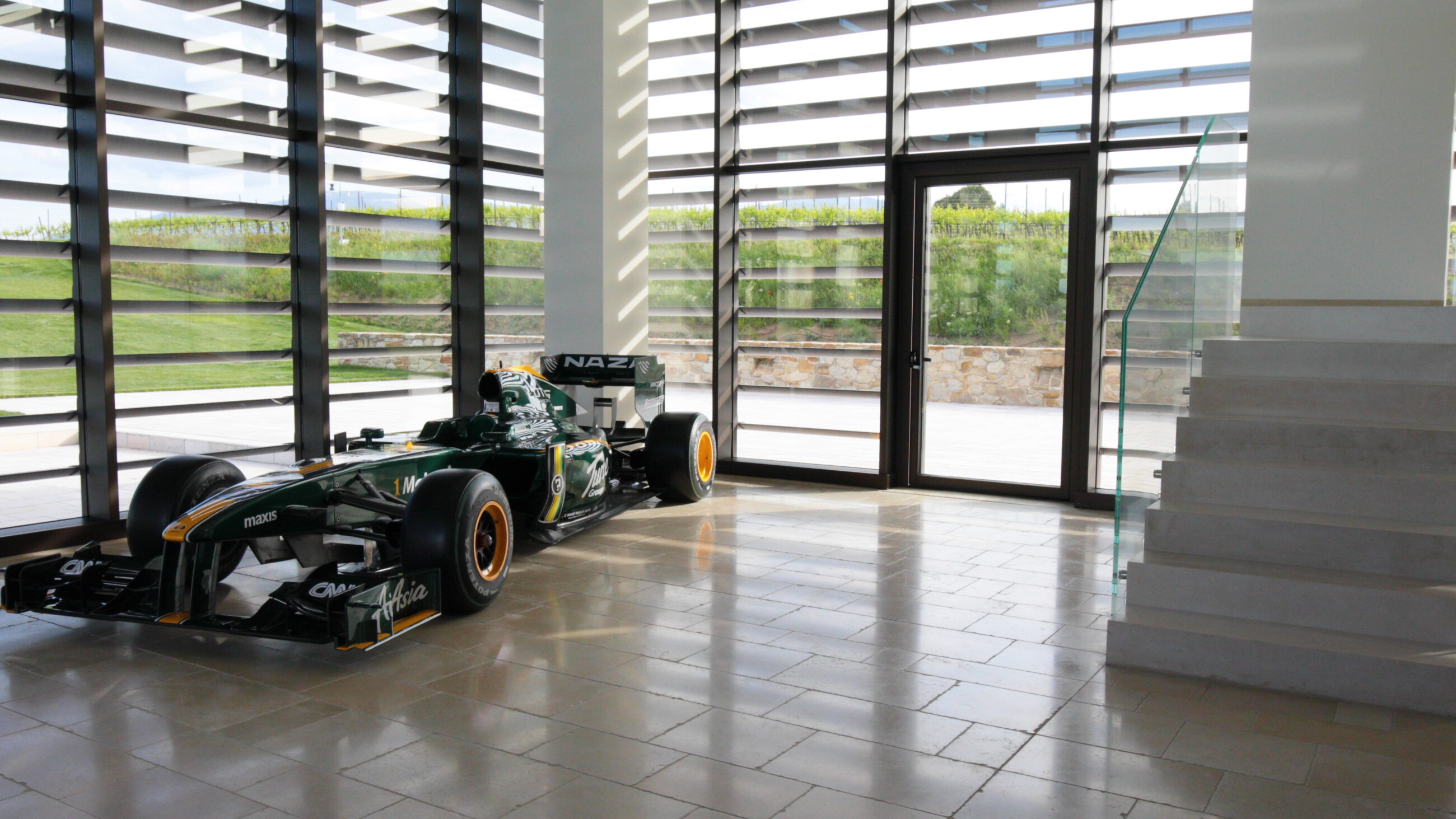 Podere Castorani gilt als eines der schönsten und dynamischsten Weingüter der Region – dem stimmen wir nach unserer Entdeckungstour uneingeschränkt zu. Im Eingangsbereich steht direkt ein echter Eye-Catcher: der ehemalige Formel-1-Rennwagen von Jarno. Weiter geht’s, vorbei an zahlreichen Auszeichnungen und Preisen, in superstylische Räume zur Verköstigung, neben einer offenen Vorführküche. Dort begrüßt uns dann tatsächlich der Hausherr Enzo Trulli persönlich – und natürlich klicken unsere Handy-Kameras!