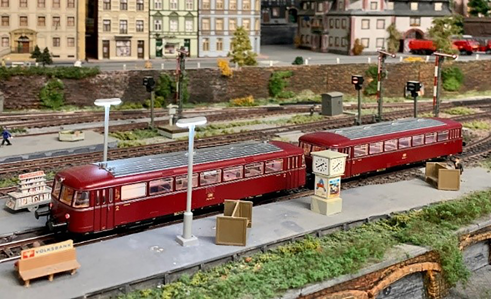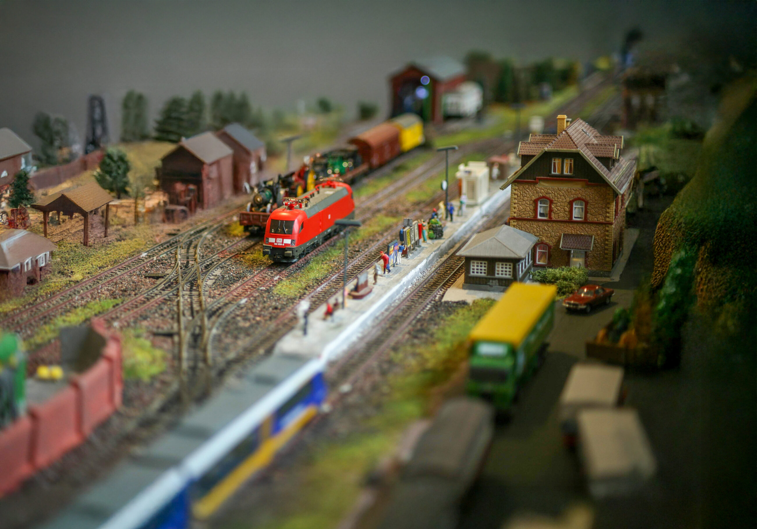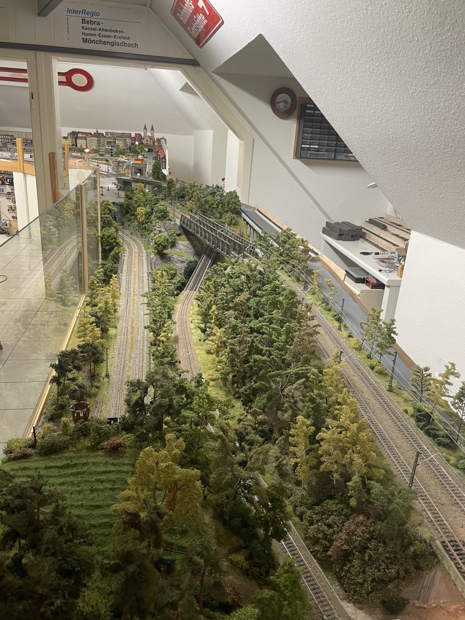 Die große Vereinsanlage »Rietkirchen« ist ein kreativ gestaltetes Phantasiestück im Maßstab 1:87 ohne konkretes Vorbild: Dampflokomotiven, ICE3, Schienbusse und CarSystem-Fahrzeuge teilen sich die Szenerie. Besonderheiten sind ein Bahnbetriebswerk (BW) mit Drehscheibe und vielerlei Modellbauszene, ein Tal mit drei selbstgebauten Eisenbahnbrücken, sowie ein üppiger Hauptbahnhof mit regem Bahnbetrieb. Ein ebenso beeindruckendes Feature ist das CarSystem: ca. 120 Meter Magnetband, 84 ServoWeichen, 350 Rückmelder und zahlreiche Fahrzeuge inklusive automatisierter RoLa-Verladung – gesteuert über iTrain und BiDiB-Technik. Ein Highlight ist die Feuerwehr, die im Brandfall mit Sirene ausrückt und sogar ihre Drehleiter ausfährt.