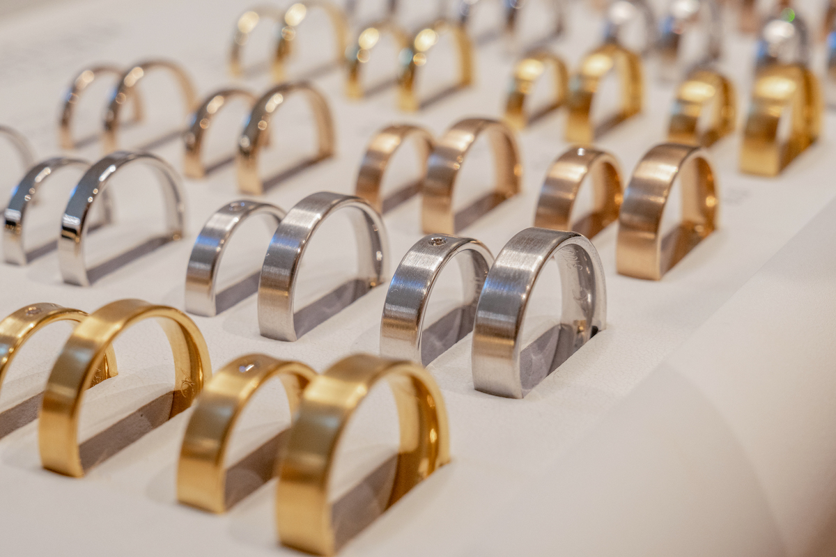 Das Sortiment ist ebenso vielfältig wie die Wünsche der Paare: klassische, moderne oder extravagante Designs, einfarbig oder Tricolor, mit Gravuren, Stufen oder filigranen Mustern. Ob Laser- oder Diamantgravur – der Fantasie sind kaum Grenzen gesetzt. Über 100 Musterringe stehen zur Anprobe bereit – in verschiedensten Legierungen, Profilen und Designs. Zusätzlich verfügt Dodt über ein Echtring-Lager mit hochwertigen, massiven Trauringen zu attraktiven Konditionen.