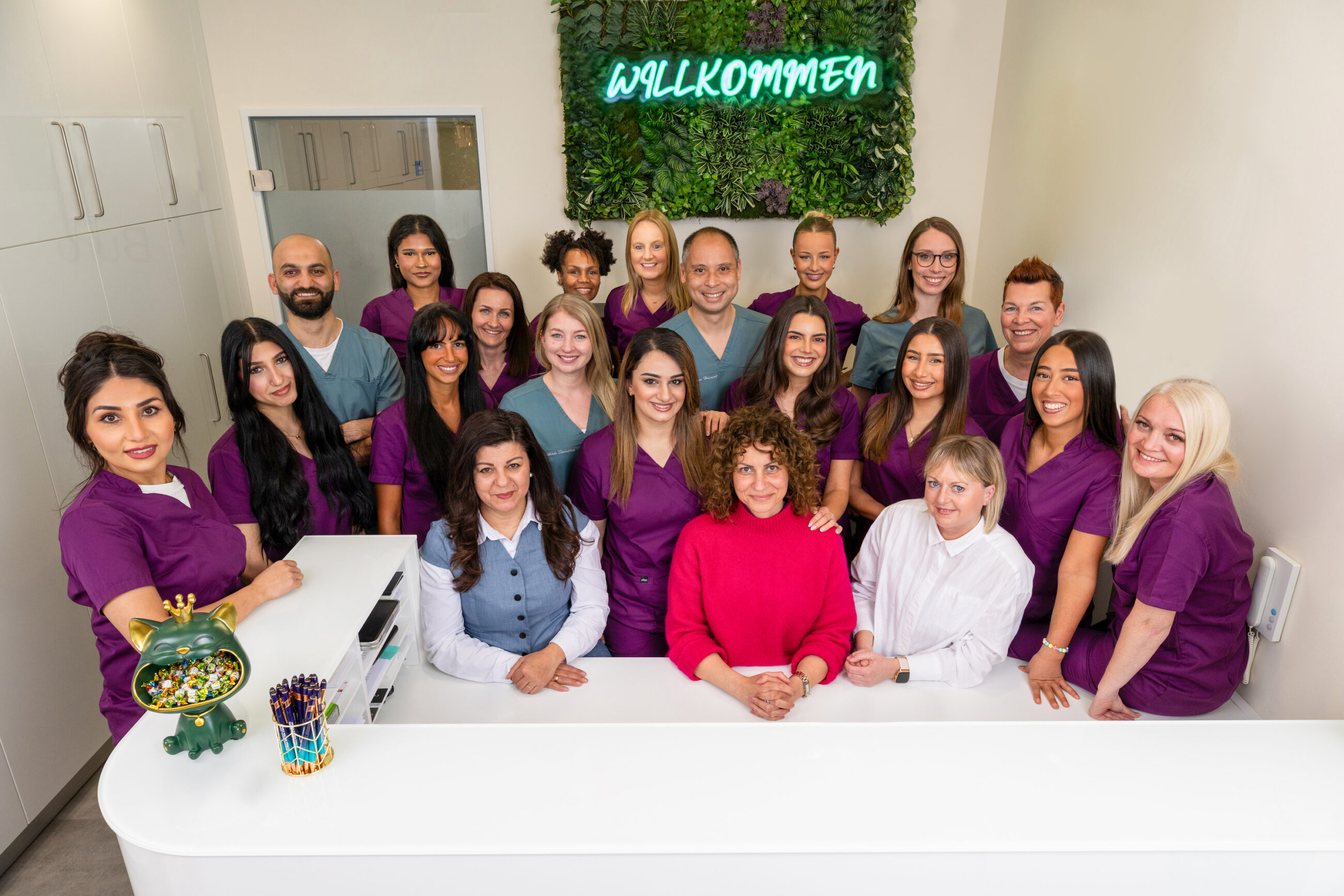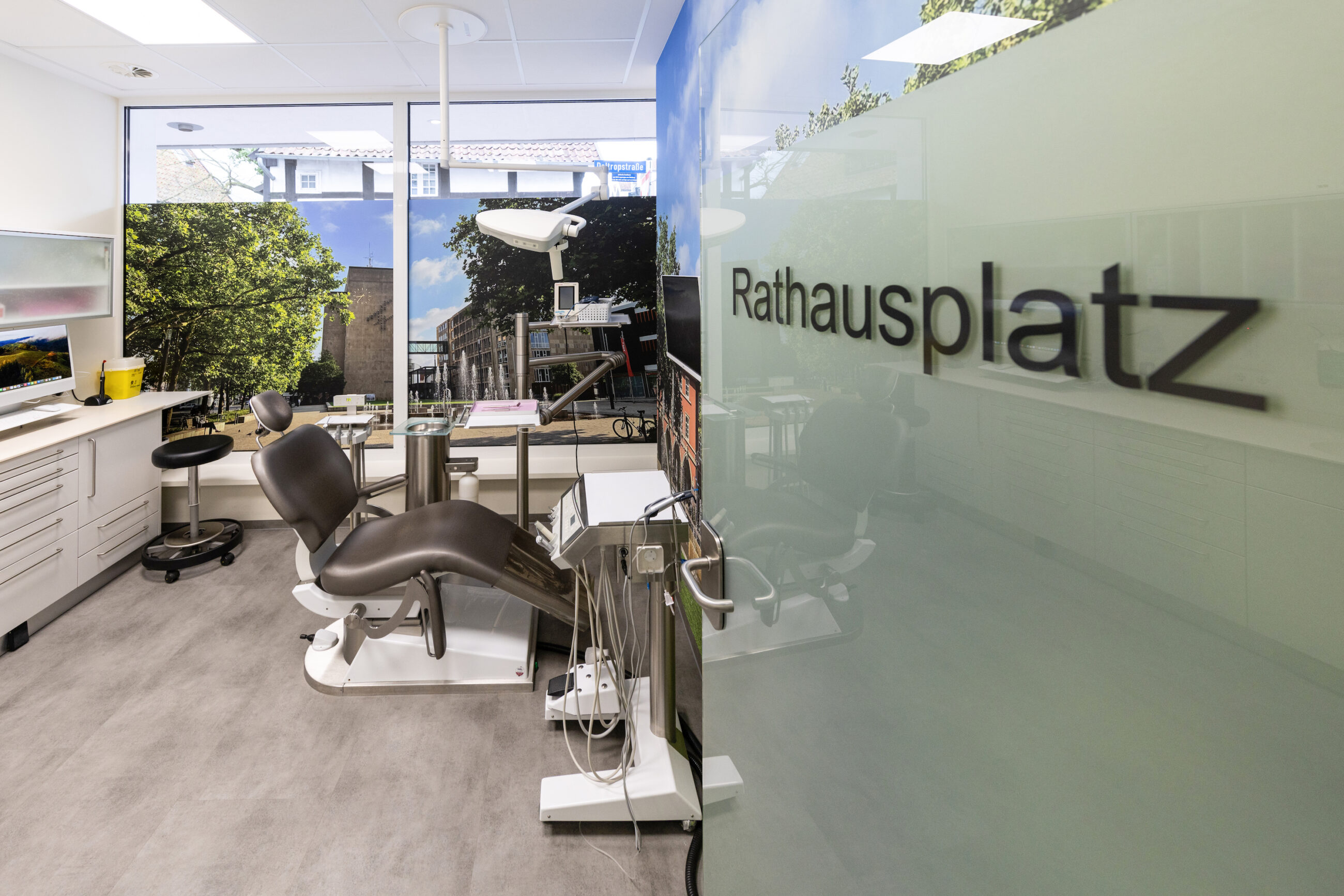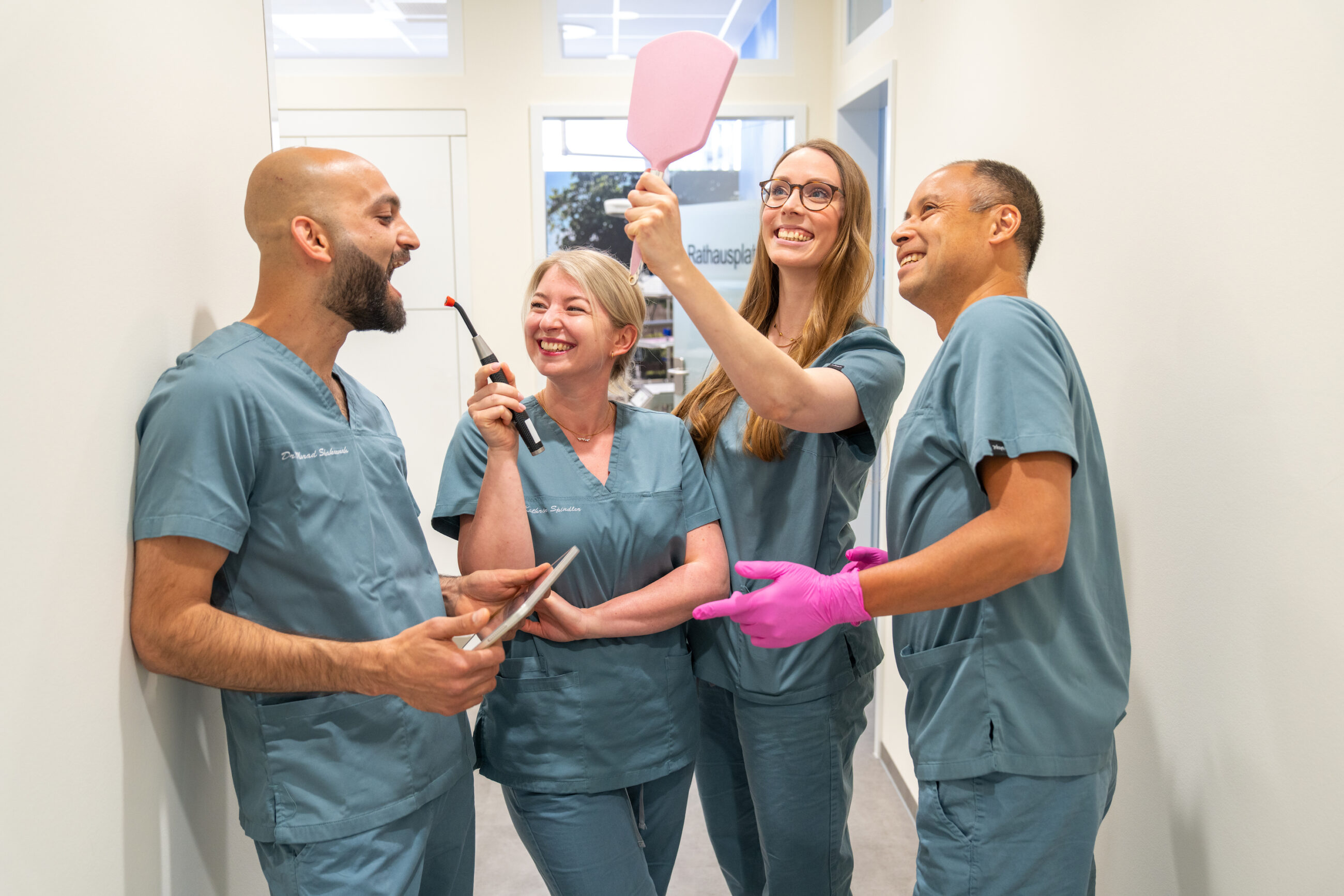 Auch Morad Shakarnah – als angestellter Zahnarzt in der Weiterbildung zum Oralchirurgen – verstärkt das Ärzteteam. Das Assistenzteam ist von anfänglich sechs auf inzwischen 22 Mitarbeiterinnen und Mitarbeiter gewachsen. Neun hochmodern ausgestattete Behandlungsräume – fünf unten, vier oben – sorgen dafür, dass alle Patienten bestens versorgt sind. Im Erdgeschoss heißen die Räume wie unsere stadtbekannten Plätze: »Berliner Platz«, »Dreiecksplatz«, »Rathausplatz«
