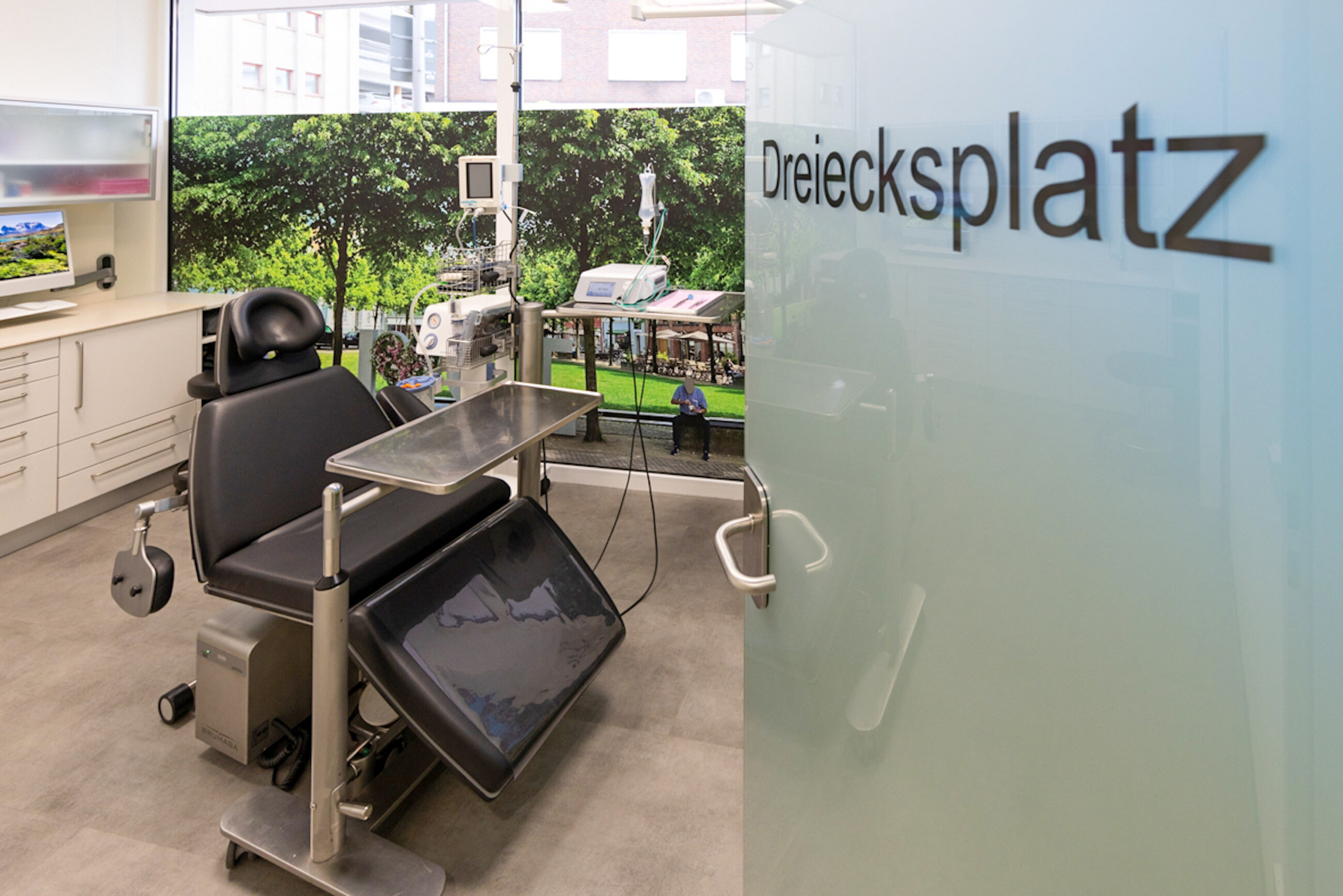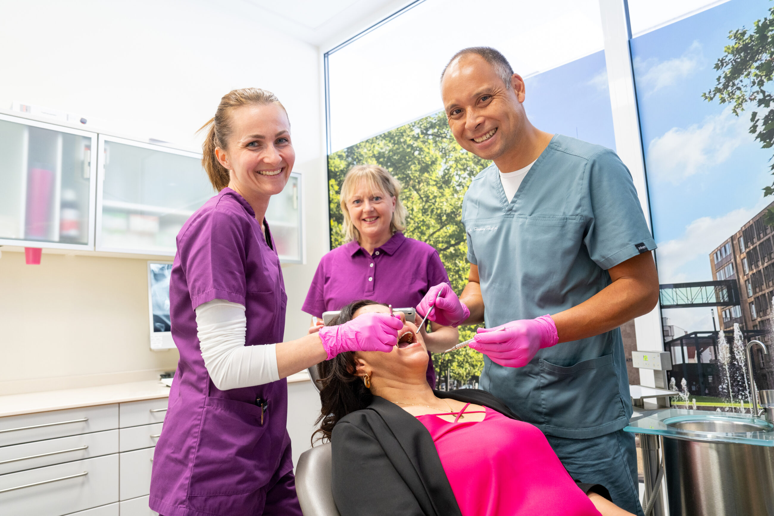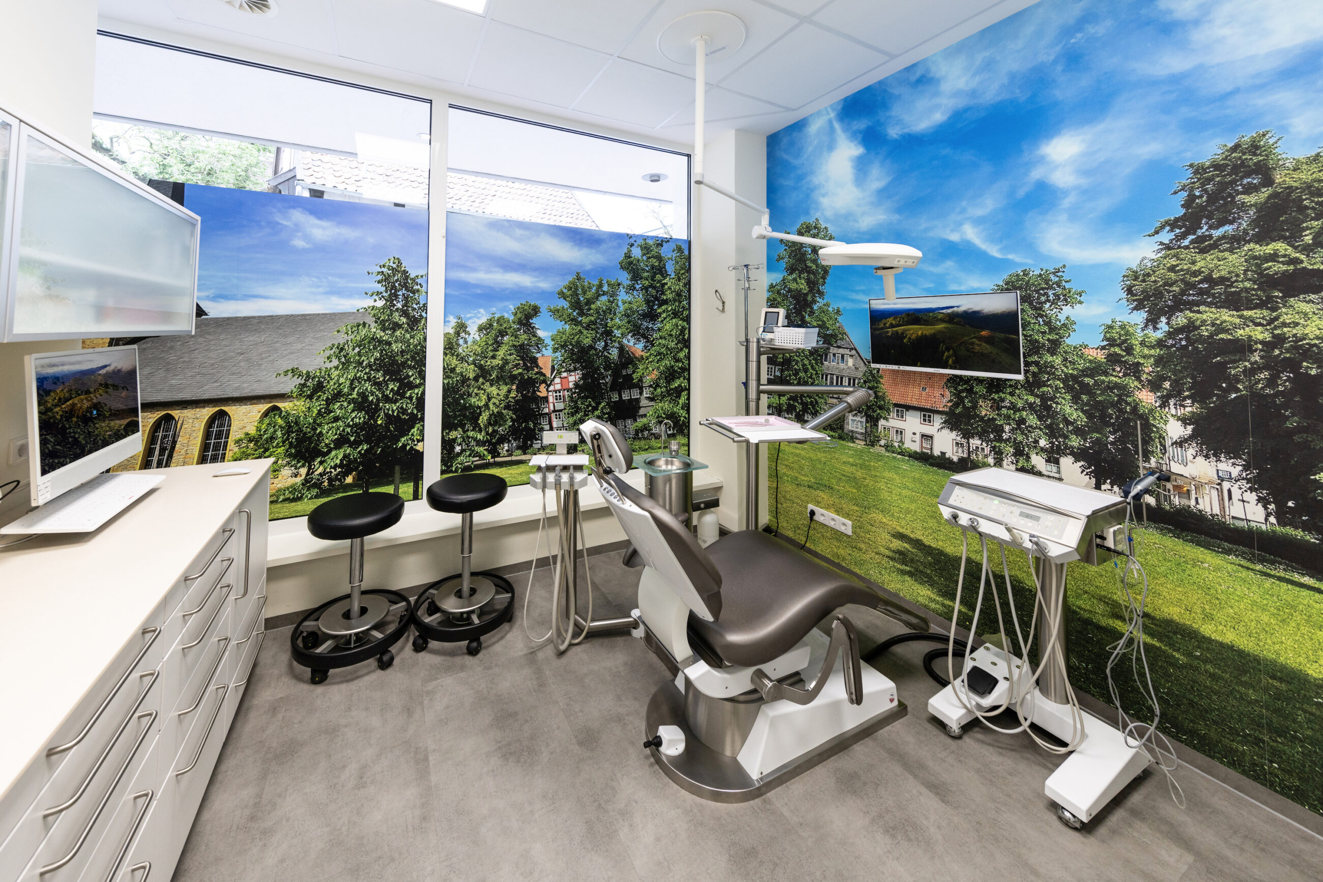 Auch Morad Shakarnah – als angestellter Zahnarzt in der Weiterbildung zum Oralchirurgen – verstärkt das Ärzteteam. Das Assistenzteam ist von anfänglich sechs auf inzwischen 22 Mitarbeiterinnen und Mitarbeiter gewachsen. Neun hochmodern ausgestattete Behandlungsräume – fünf unten, vier oben – sorgen dafür, dass alle Patienten bestens versorgt sind. Im Erdgeschoss heißen die Räume wie unsere stadtbekannten Plätze: »Berliner Platz«, »Dreiecksplatz«, »Rathausplatz«