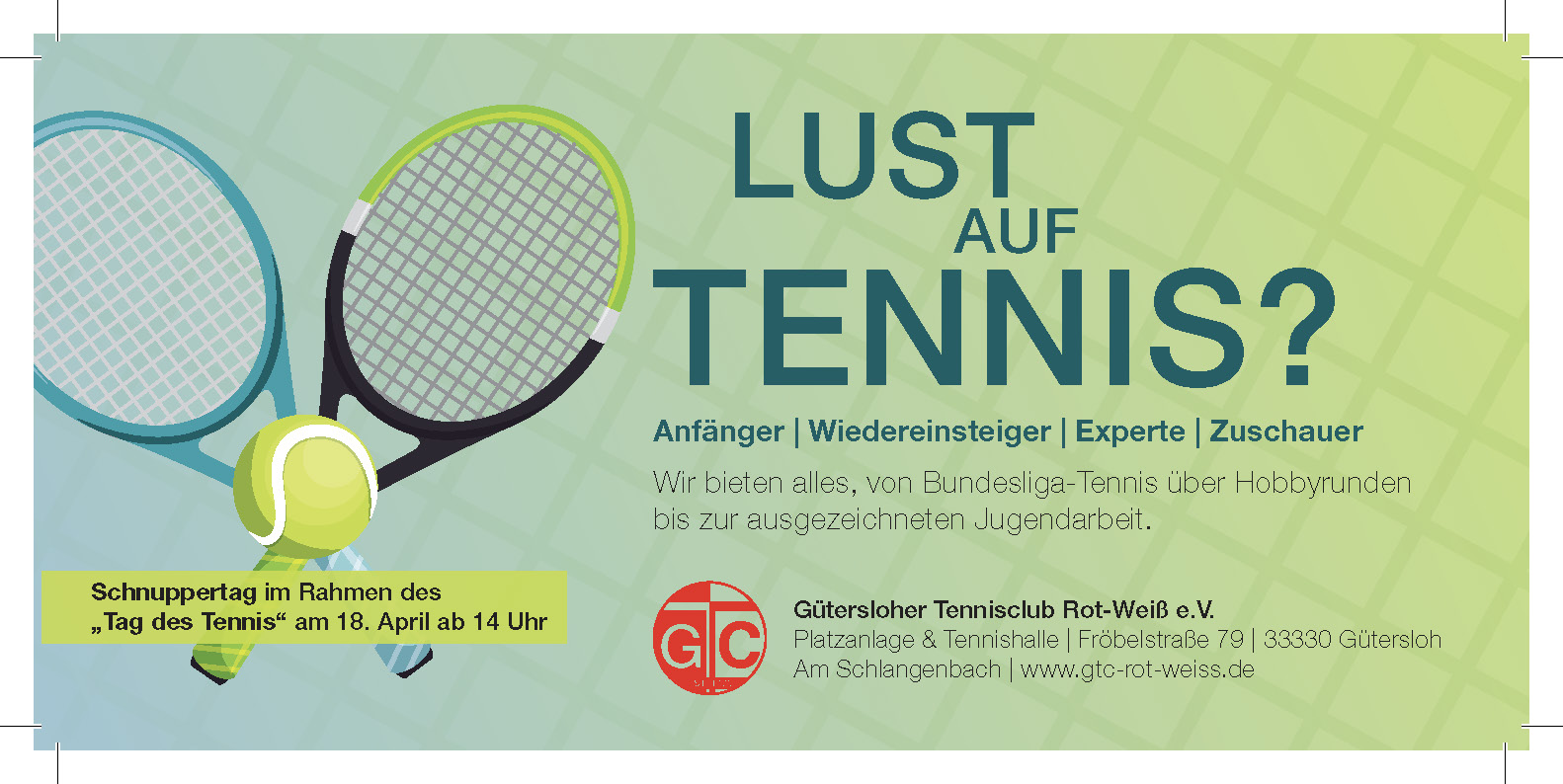 Der Tennissport hat in Deutschland eine bewegte Entwicklung erlebt – vom elitären Weißsport über den Boom der Becker-/Graf-Ära bis hin zum heutigen Breiten- und Freizeitsport für alle Generationen. Ein großer Vorteil: Für ein Tennismatch braucht es nur einen Partner. Diese Flexibilität passt ideal in den heutigen Alltag. Beim Gütersloher Tennis-Club Rot-Weiß geht es jedoch um mehr als nur Sport. Geselligkeit gehört dazu – etwa auf der Clubterrasse oder bei gemeinschaftlichen Veranstaltungen. Zu Ostern reisen rund 100 Mitglieder ins Trainingslager an den Gardasee, bevor auf der heimischen Anlage die Sommersaison mit zahlreichen Mannschaftsspielen startet.