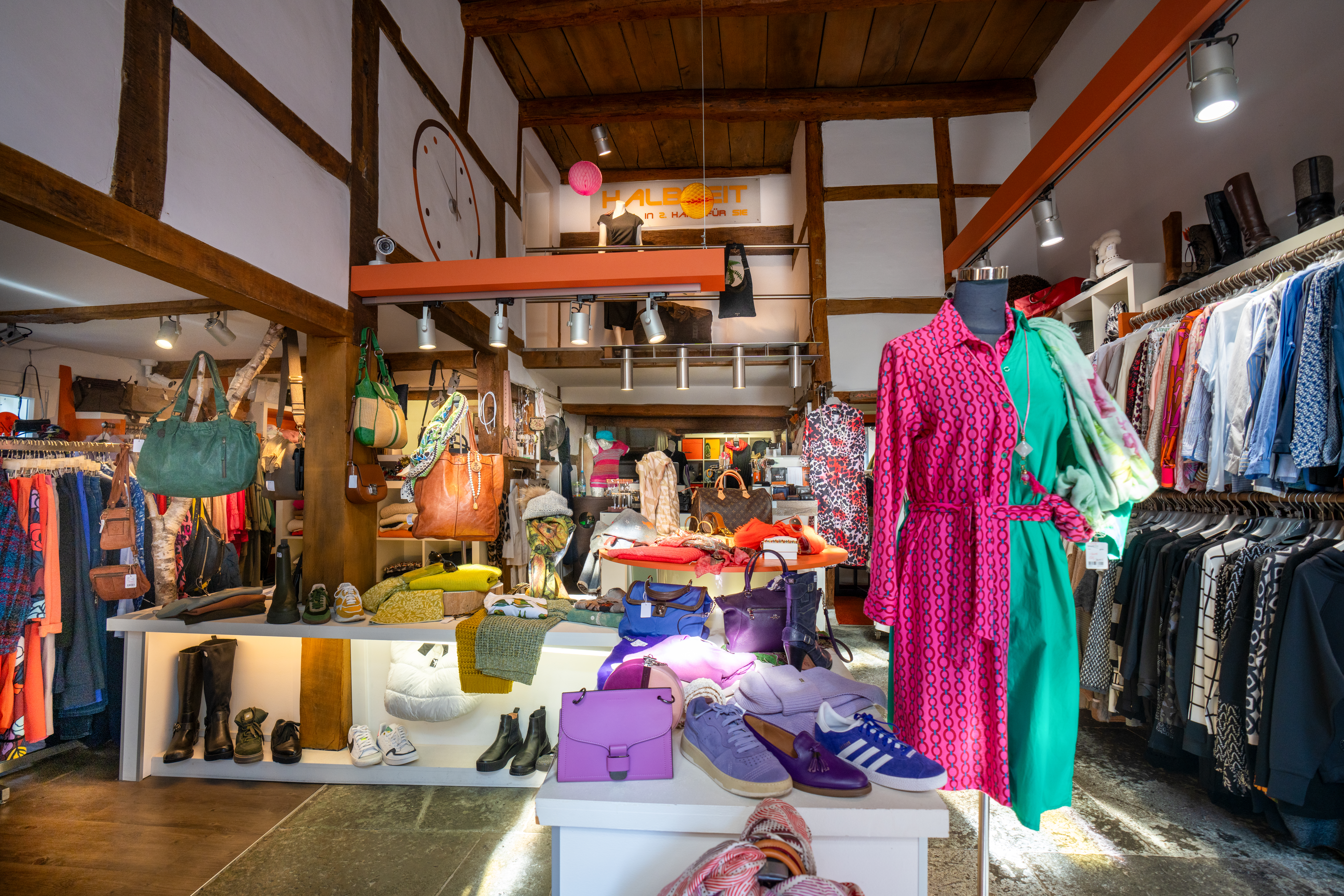 Selbstverständlich gibt es auch viele schöne Accessoires, wie hochwertigen Schmuck, Cashmere-Schals, Gürtel, Sonnenbrillen oder Ledertaschen. Seit einiger Zeit bietet Halbzeit in Kooperation mit »Labelstorys« auch After Work Shoppingpartys an.