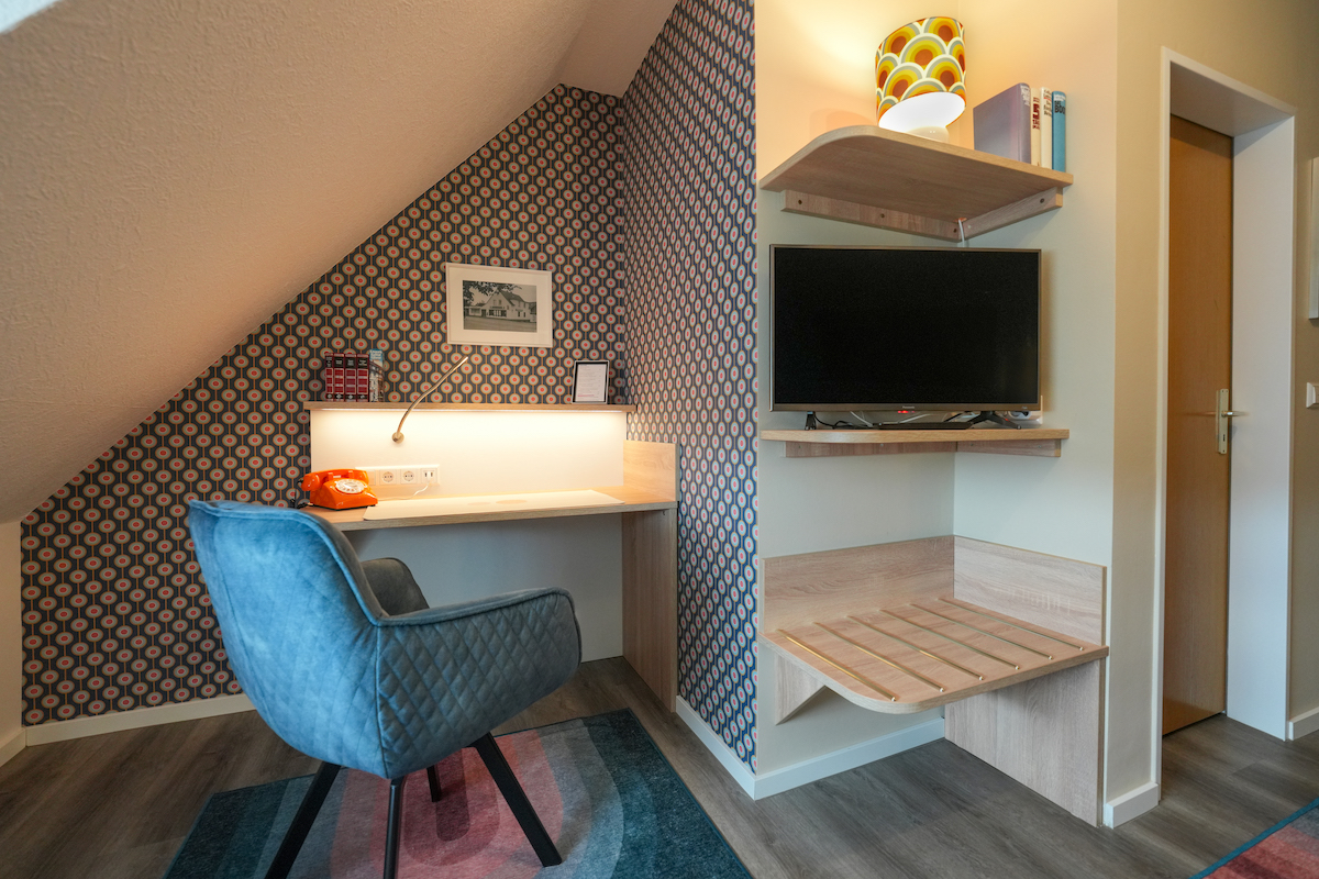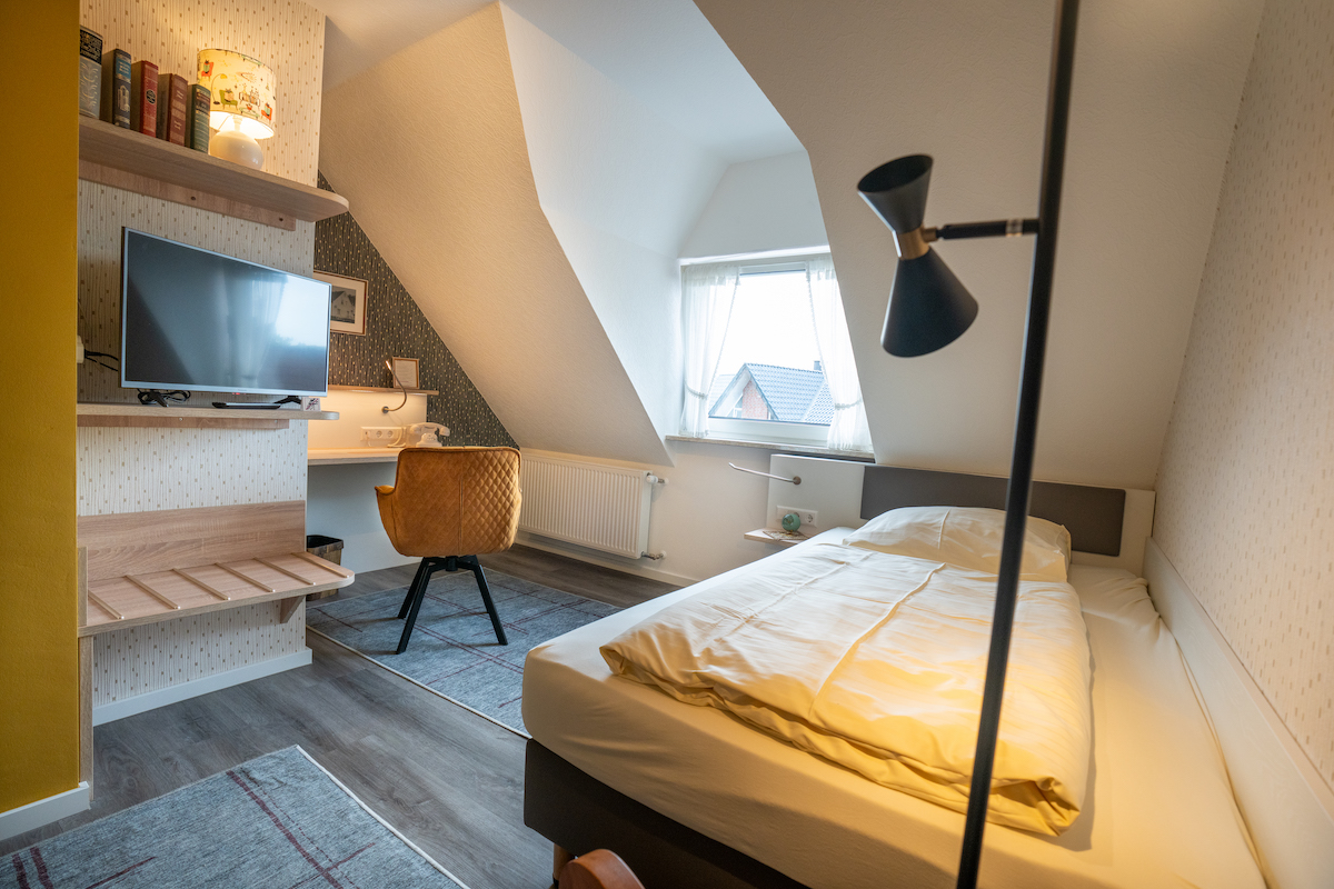 Jedes Zimmer trägt ein Thema, jedes Detail ist bewusst gewählt und versetzt den Gast in eine Zeit, die lange vor heute lag.DabeihatmanaberalleVorteilederheutigenZeitinden durchweg renovierten Hotelzimmern. Dazu gehören Glasfaser- Internet, moderne Bäder und ein gemütliches Ambiente, das Reisende sofort ankommen lässt. Geschäftsreisende, Monteu- re, aber auch Familien fühlen sich hier gleichermaßen wohl – weil man spürt, dass hier mit Liebe eingerichtet wurde.