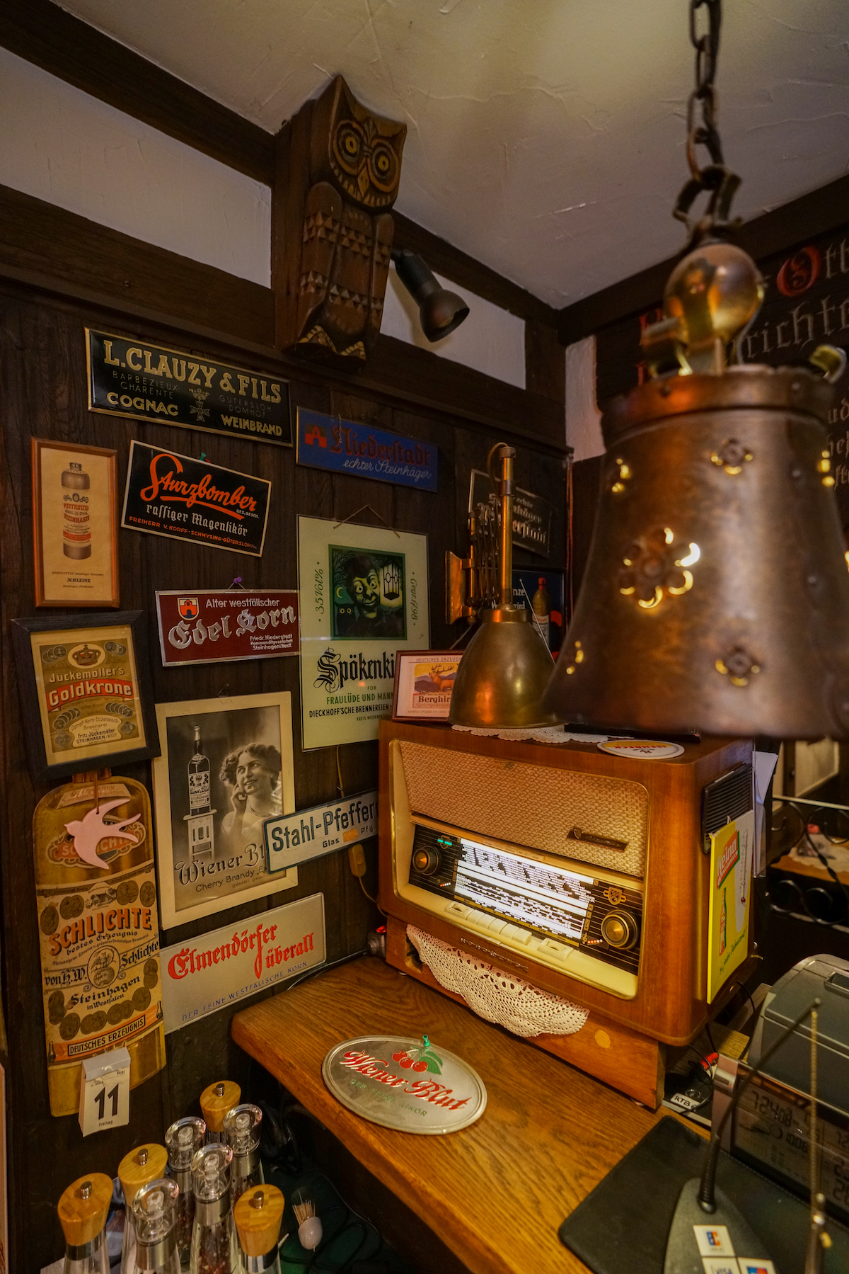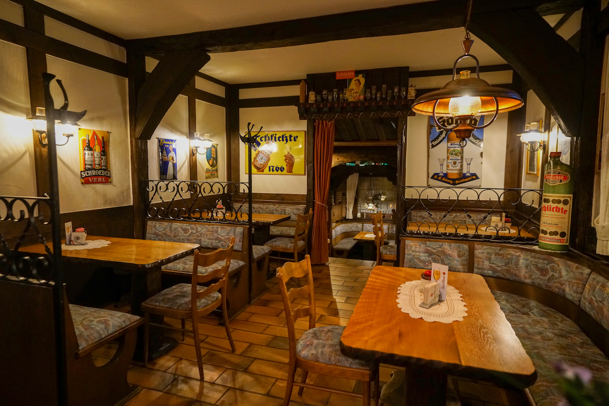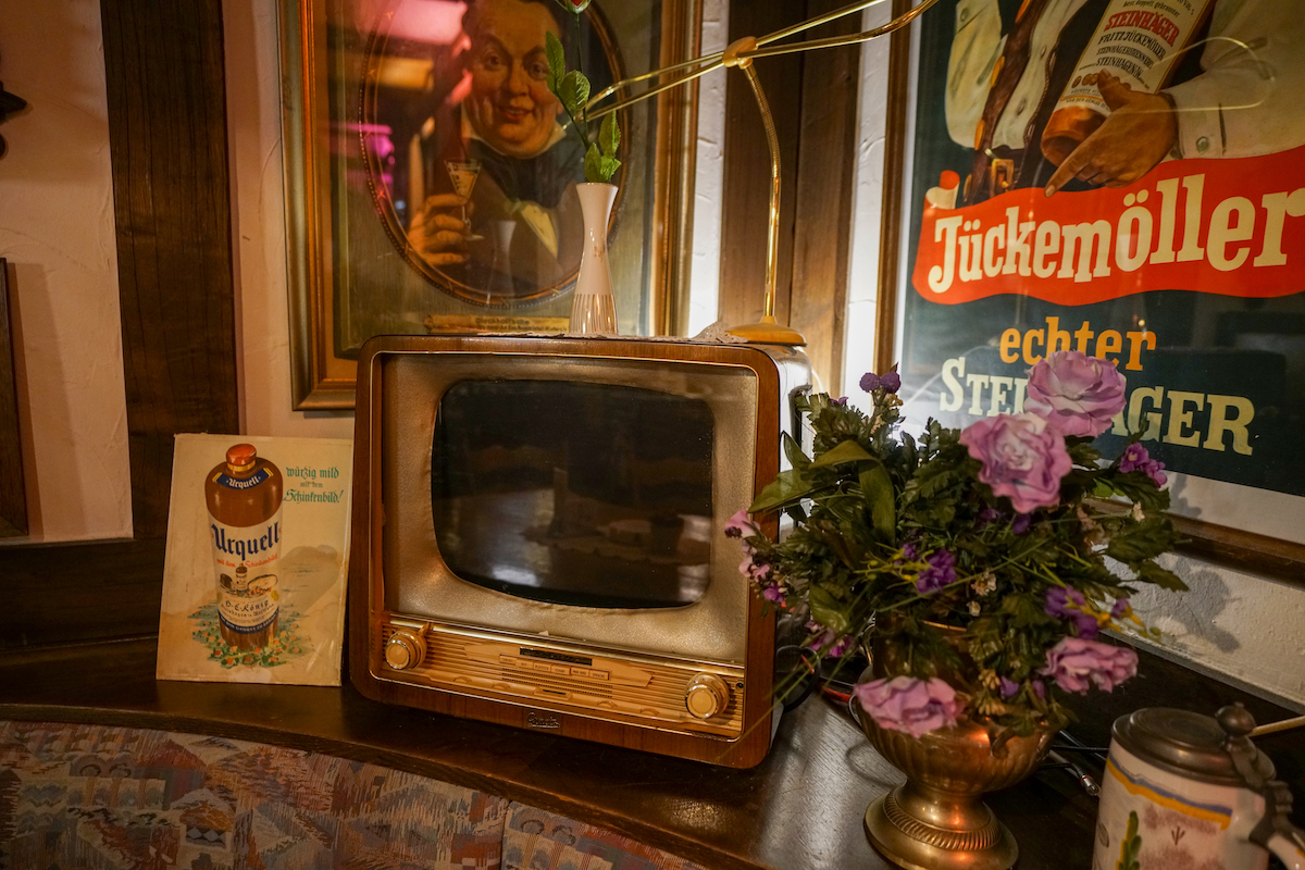 Nur ein paar Schritte weiter – und man tritt in eine andere Welt. Die Gaststube, seit 1972 nahezu unverändert, wirkt wie eine Zeitkapsel. Holzvertäfelungen, alte Radios, bunte Blechschilder und Sammlerstücke, die Volker Beckord in Jahrzehnten zusammengetragen hat. Hier wirkt nichts künstlich inszeniert, alles ist echt gewachsen.