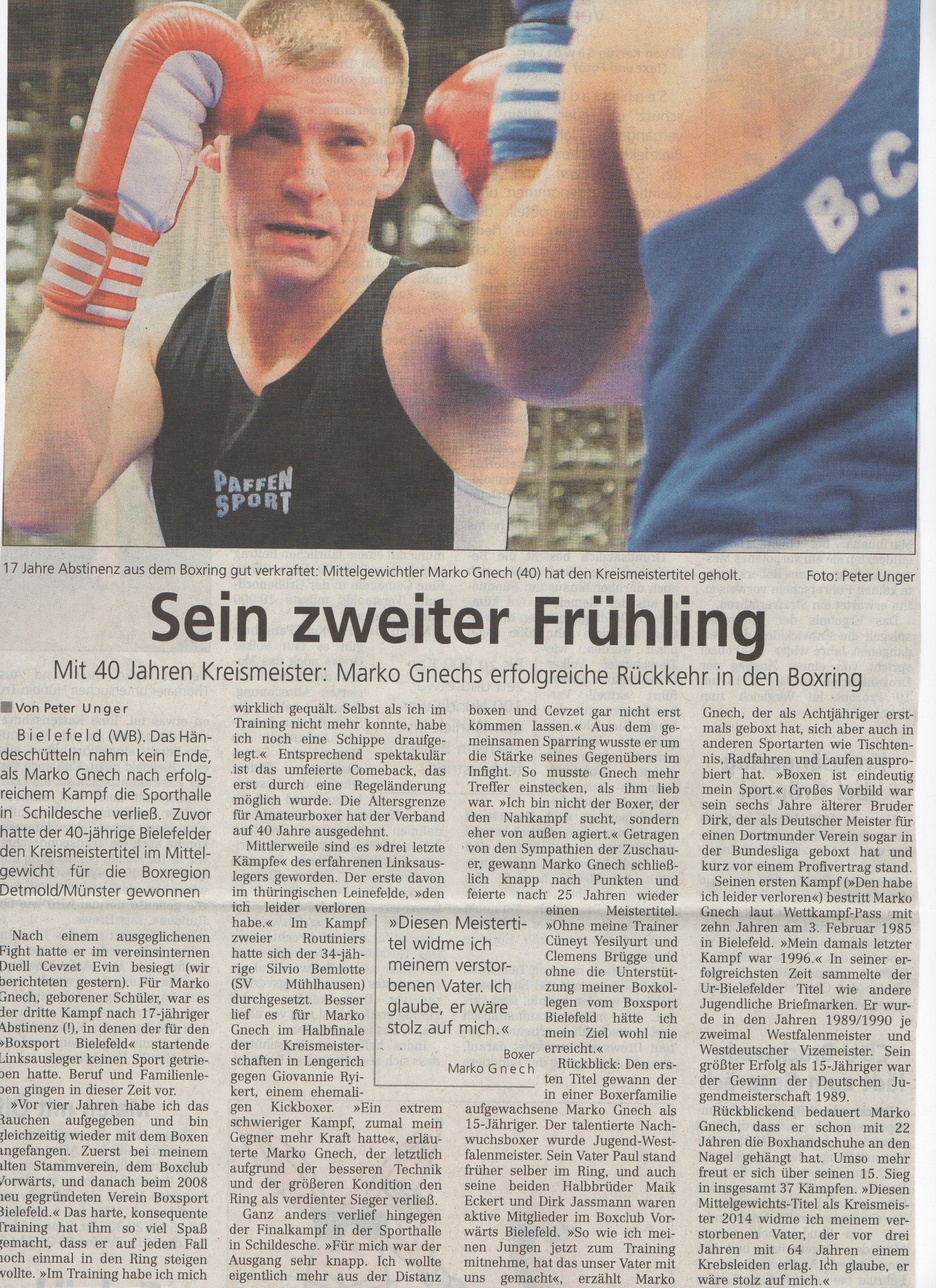 Wenn Marko Gnech morgens zu seinen Kunden fährt, ist das ein gewohntes Bild in Steinhagen. Der drahtige Schornsteinfegermeister mit dem schwarzen Arbeitsanzug und Zylinder ist bekannt – als zuverlässiger Handwerker und freundlicher Nachbar. Doch wer nur diesen Teil von ihm kennt, hat eine Seite seines Lebens verpasst: Denn abends wird aus dem Schornsteinfeger ein Boxer. Und das mit beeindruckender Ausdauer und Leidenschaft – selbst mit über fünfzig (Jahrgang 1974).