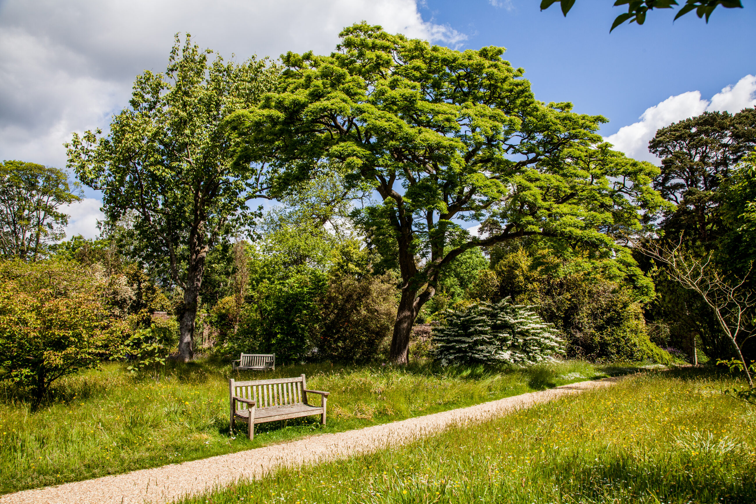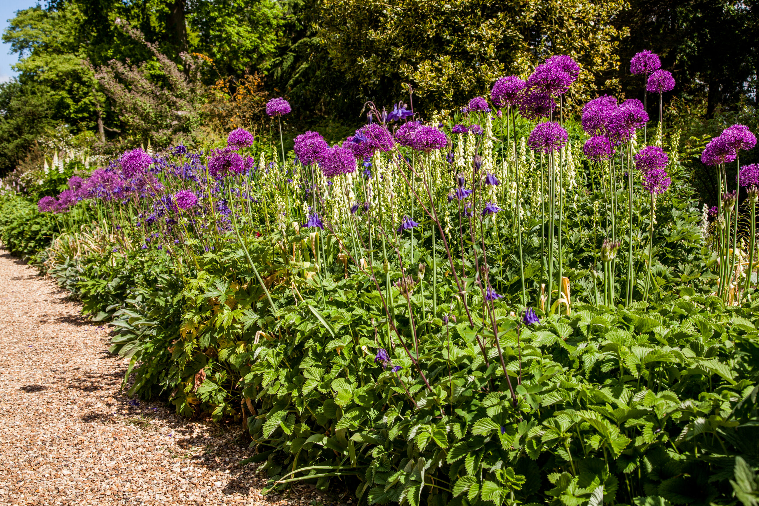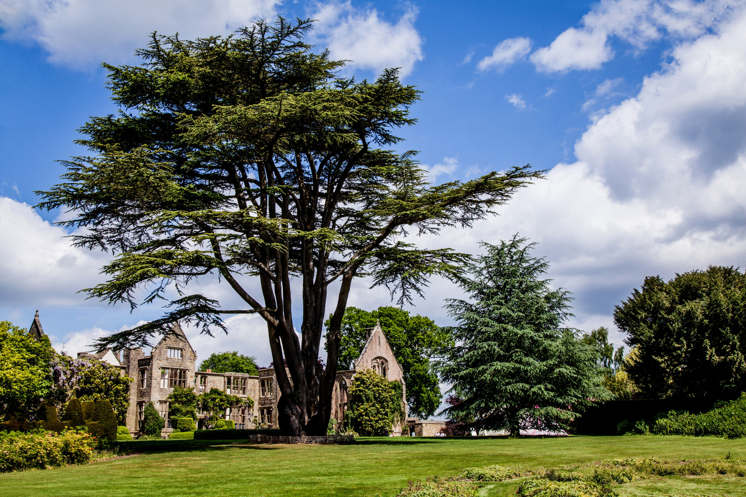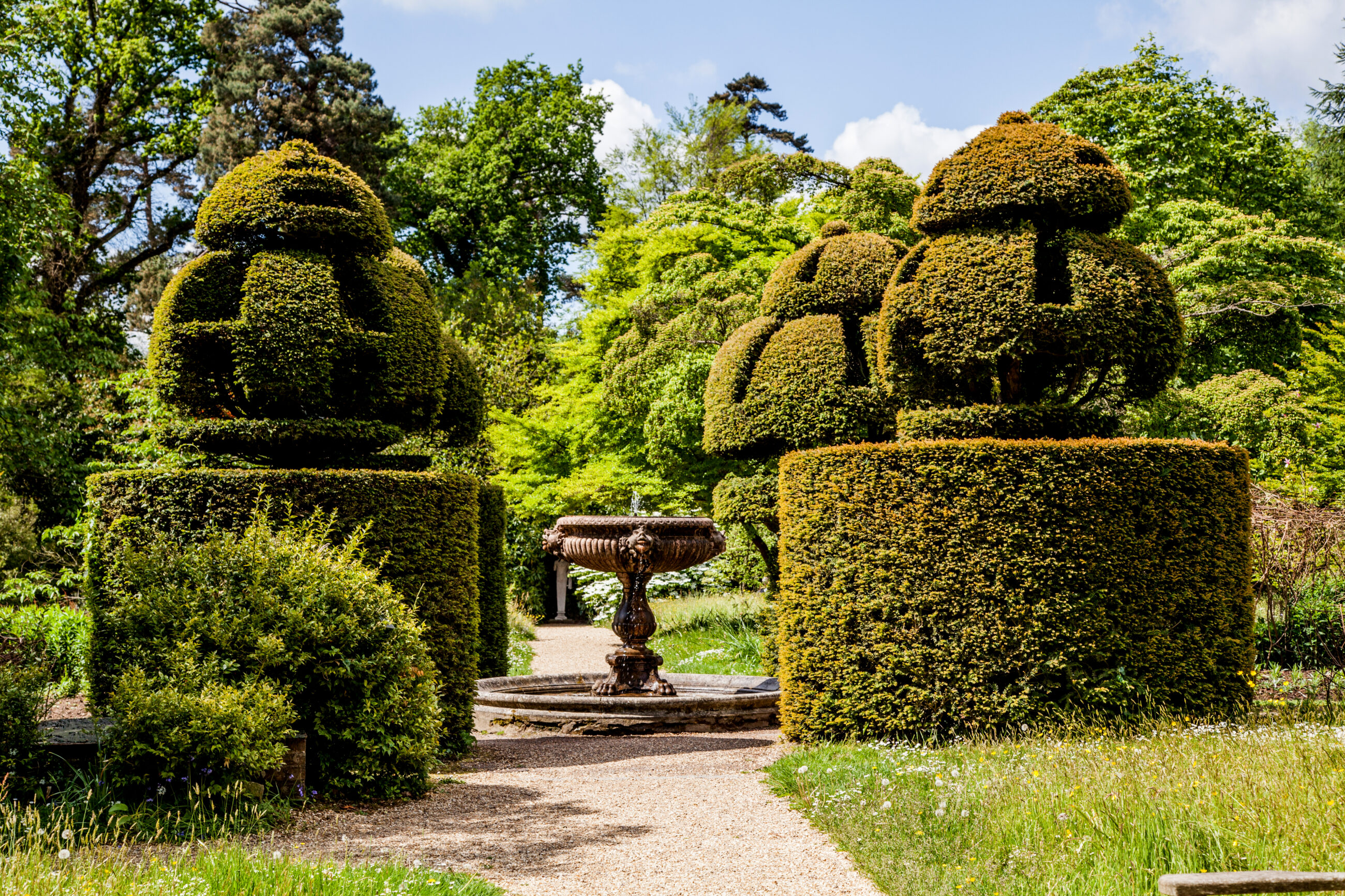 Nymans Garden in West Sussex ist ein schönes Beispiel für englische Gartenkunst, eine harmonische Verbindung aus romantischer Ruinenarchitektur, botanischer Vielfalt und interessanter Familiengeschichte. Der Garten erstreckt sich über etwa 12 Hektar und bietet zahlreiche Aspekte, die sowohl Gartenliebhaber als auch Kulturinteressierte ansprechen. Mit klassischen Formschnitthecken und fantasievollen Topiarypflanzen aus Eiben spiegelt der Garten den typischen Charme der englischen Gartenkunst wider. Sie schaffen klare Sichtachsen, grüne Räume und bieten einen guten Kontrast zur Blütenfülle der sonst eher wilden Pflanzungen.