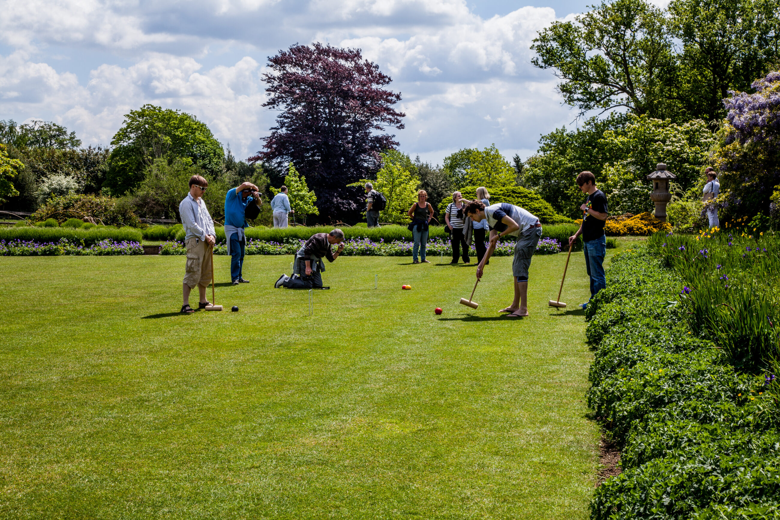 Eins der beliebtesten Gartenspiele in England ist Croquet. Es wird auf einer ebenen Rasenfläche gespielt und kombiniert Geschicklichkeit, Strategie und ein wenig Wettbewerb. Spieler schlagen mit einem Holzhammer eine Kugel durch eine Reihe von Metalltoren, die im Rasen gesteckt sind. Ziel ist es, die Kugel in einer bestimmten Reihenfolge durch alle Tore zu manövrieren und schließlich einen Pfosten zu treffen.