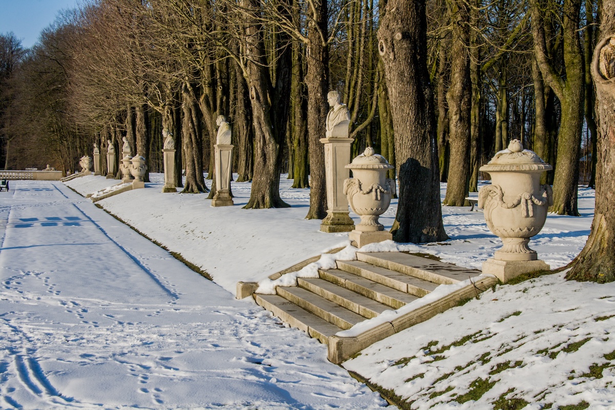 An der Ost- und Westseite der Venusinsel verlaufen erhöhte, von Kastanien gesäumte Promenaden, sogenannte Promenoirs, die rund einen Meter über dem Parterregarten liegen. Entlang der geradlinigen Wege sind Büsten römischer Kaiser und Philosophen aufgestellt.